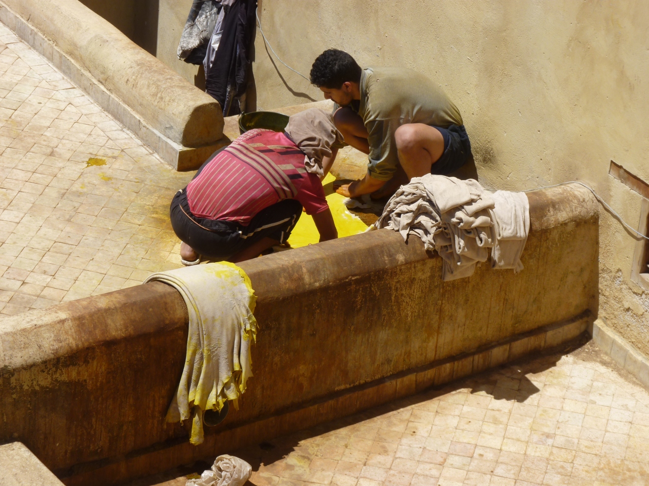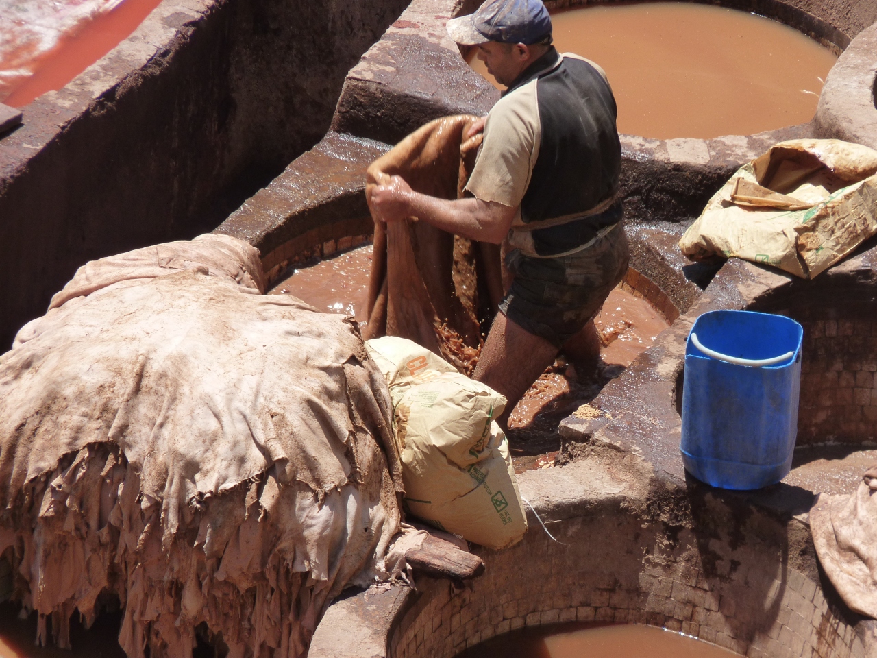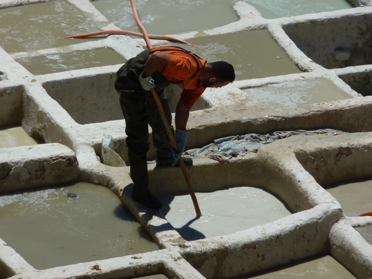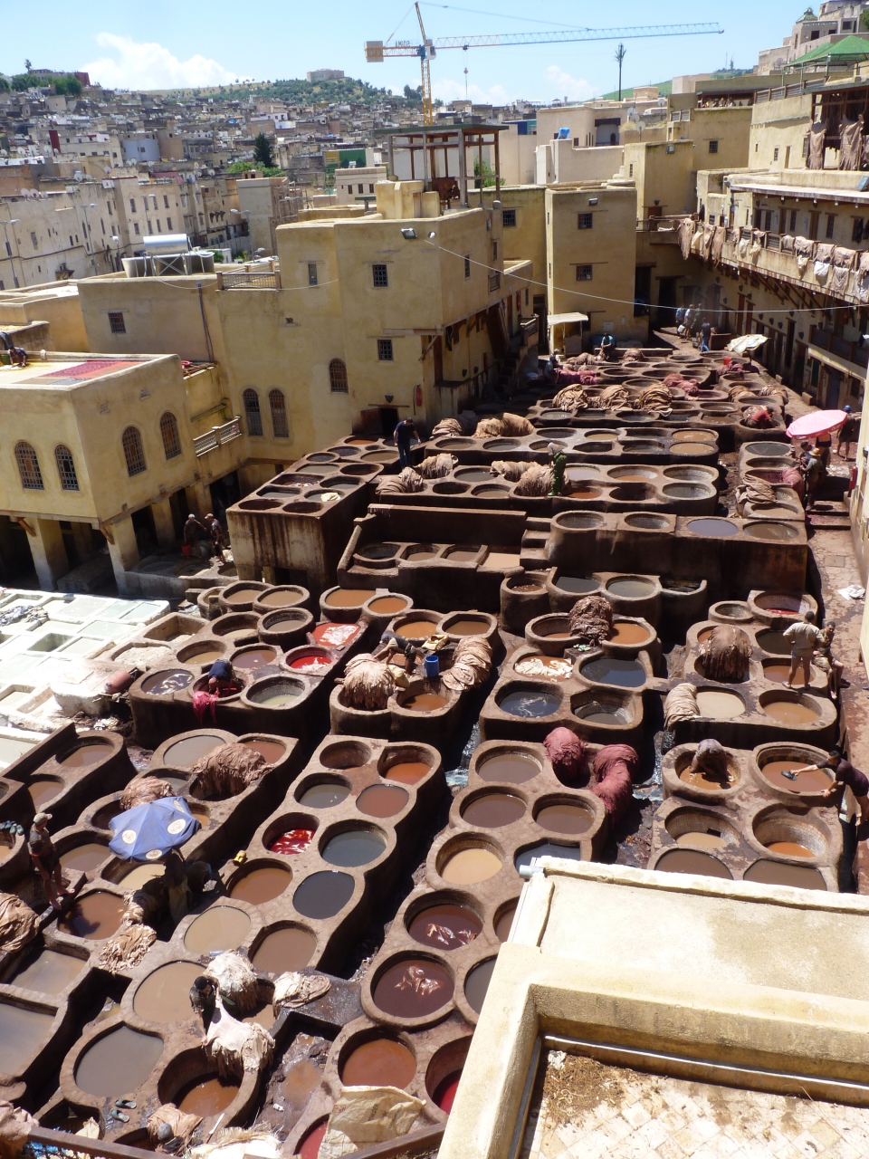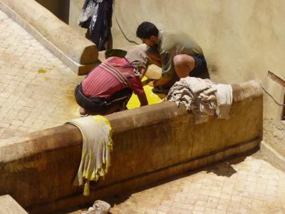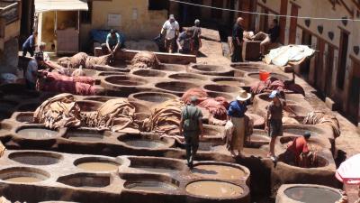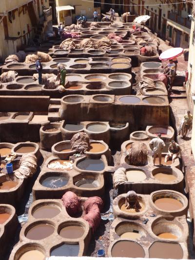 旧市街の迷路道をガイドに引きつられ、人一人が通れる通路を潜り抜け階段口にたどり着く。ここでにおい消し用のミントの葉っぱを配られる。匂いが強烈ゆえ葉に先にミントを当て見学するのです。三階まで案内され手すり越しに皮のなめし工場で働く人たちの工場見学のようなものです。その働きぶりは職人のたくましさを感じる風景が見られた。」