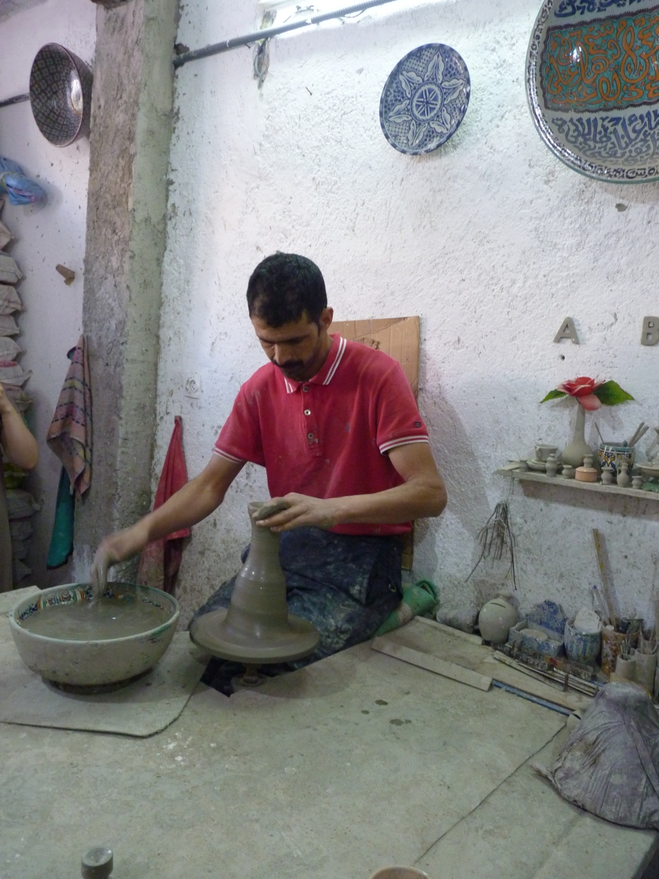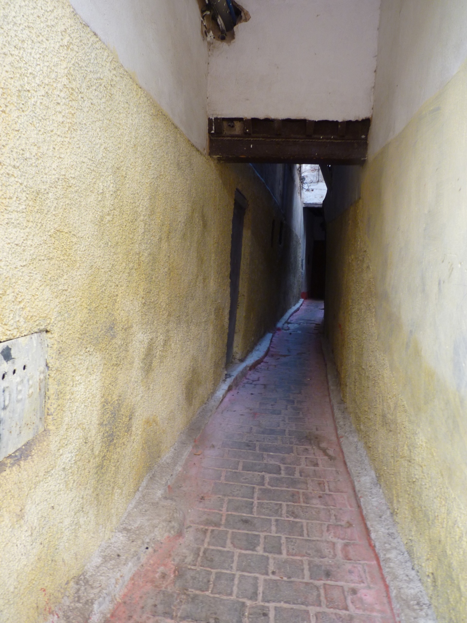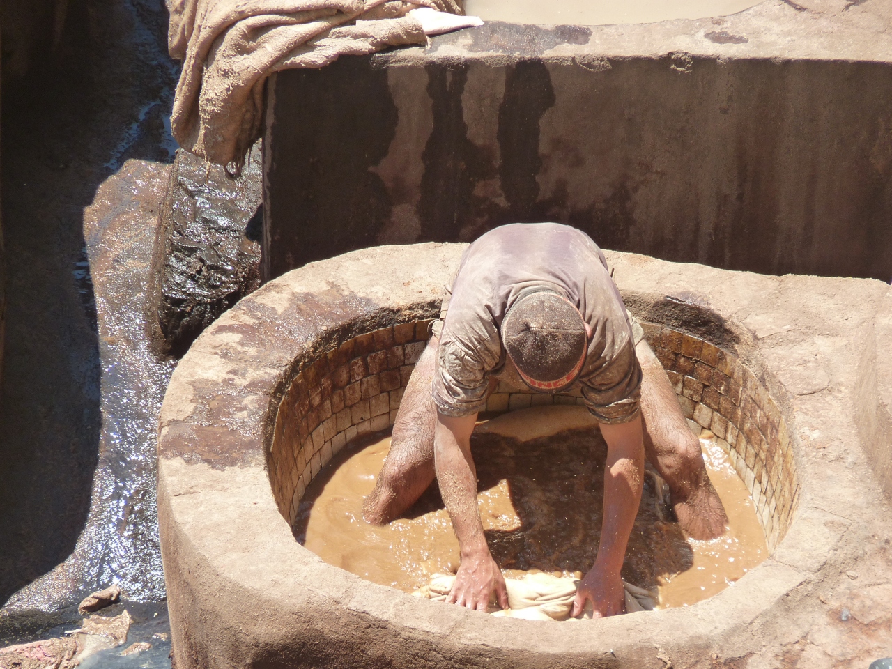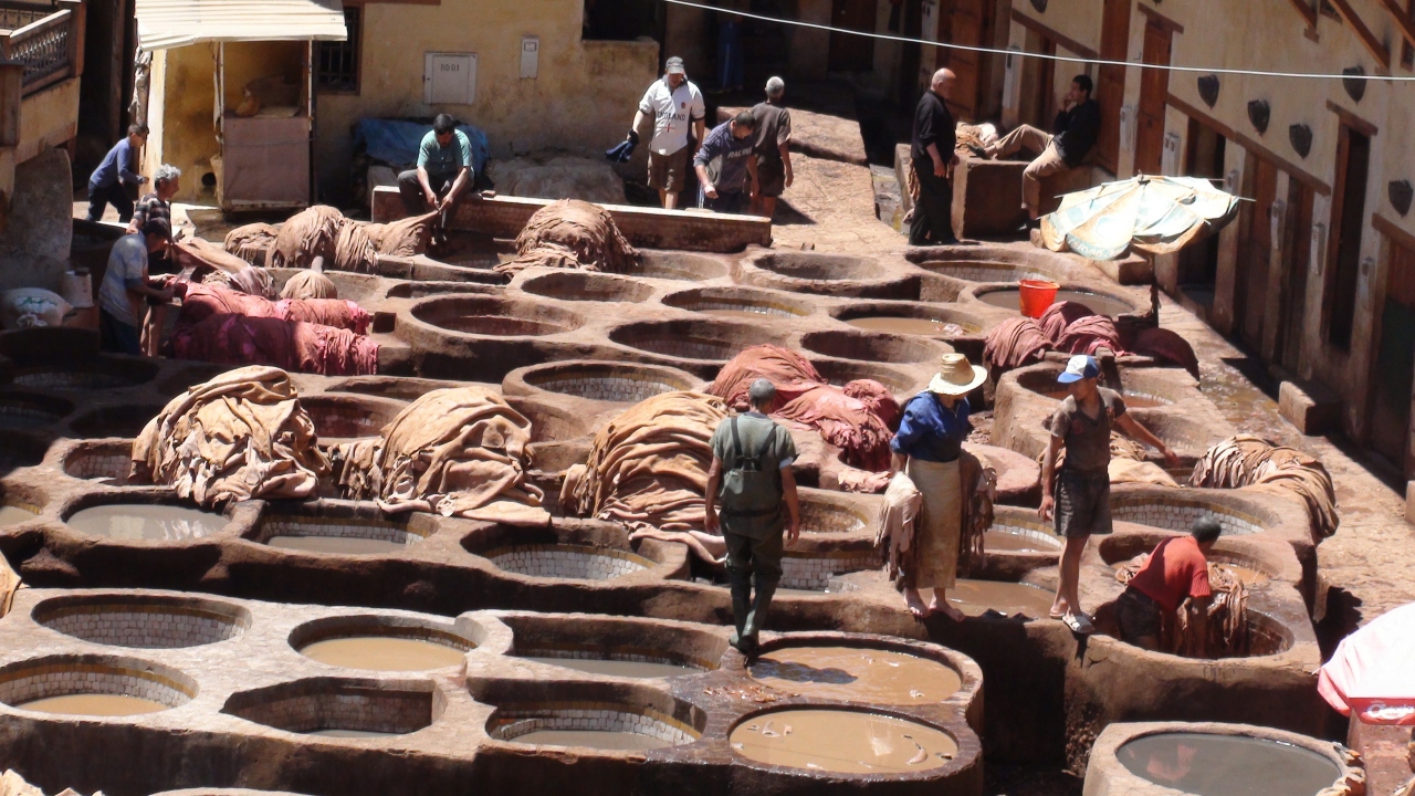 旧市街の迷路道をガイドに引きつられ、人一人が通れる通路を潜り抜け階段口にたどり着く。ここでにおい消し用のミントの葉っぱを配られる。匂いが強烈ゆえ葉に先にミントを当て見学するのです。三階まで案内され手すり越しに皮のなめし工場で働く人たちの工場見学のようなものです。その働きぶりは職人のたくましさを感じる風景が見られた。」