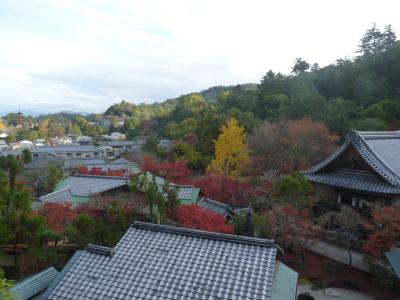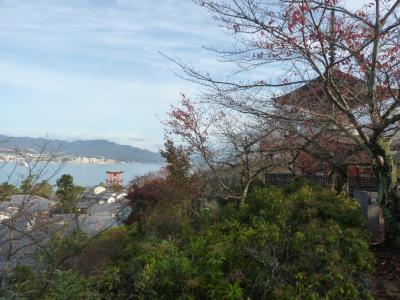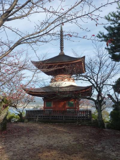 僧周歓と云う人が建てた高さ約16mの多宝塔で丘の上にある。そこから眺める島の風景は絶景であった。下からは大聖院を目指す歩道を歩いての登り坂の途中にあるこじんまりとした塔です。観光客はほとんどいなく、紅葉した紅葉の下の散歩でした。