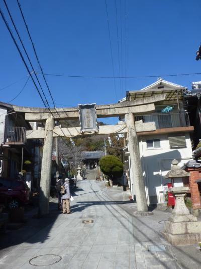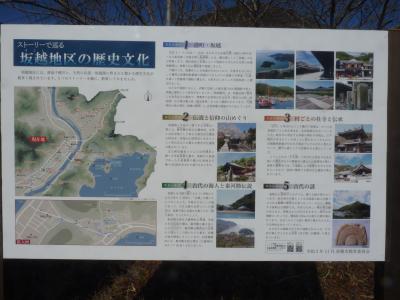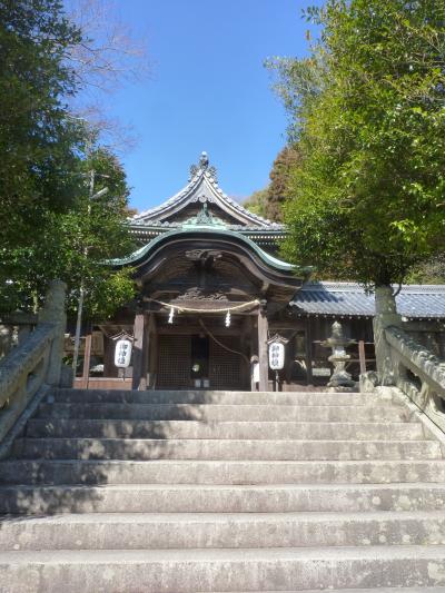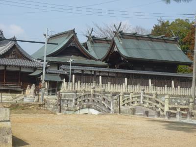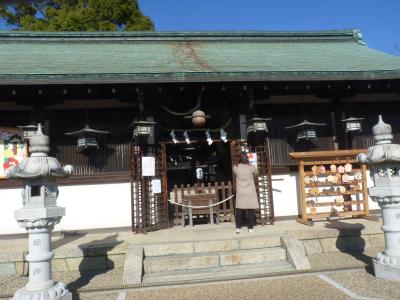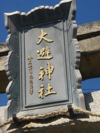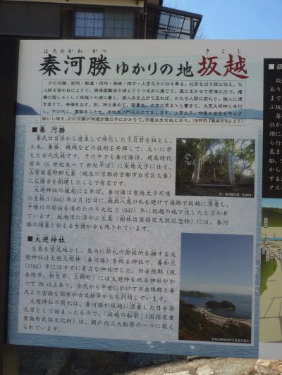 坂越の町並みを外れ、東へ海岸沿いを少し歩くと奥に鳥居が見える。少し坂道を上がってゆくと鳥居に「大避神社」(おおさけ)の額が上がった鳥居舌を潜ると本殿に辿り着く。644年に蘇我入鹿から逃れた秦河勝が祭神とされている。本殿に有る絵馬を見ながらパワースポットを貰い、坂越湾を望みながら下段する。ここの桜は春の名物の一つになっている。