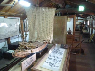 大道を少し歩いた右側に堂々とした酒蔵が見える。その奥まった一角に郷土資料館があり無料で拝観できる、酒造りの道具や商品を積み込んで上方まで運んだ船の模型や当時の生活用具等が所狭しと並んでいる。当時の酒造りの歴史を遡って見れたり、酒造の歴史が現物で展示されているのも興味深い。
