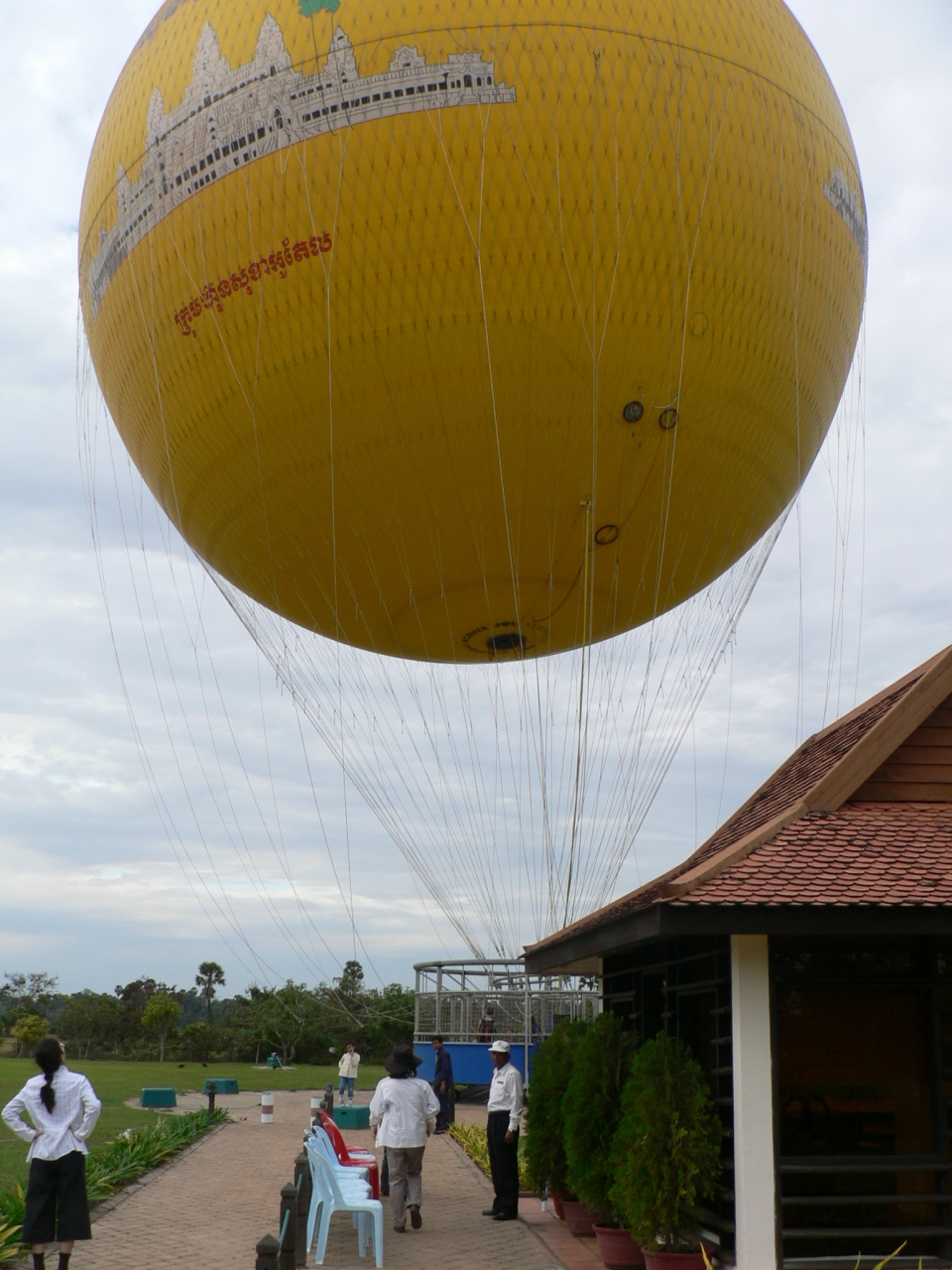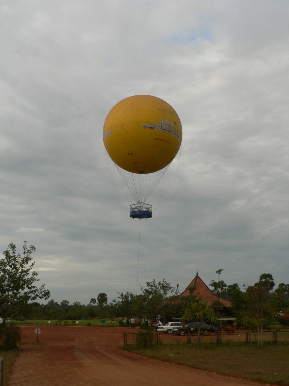 アンコールワットを上空から見れると聞いてわざわざタクシーを飛ばして乗り場まで駆けつけ、15分間の体験飛行を楽しみにし乗船した。5分ほど経過して眼科に広がる景色を必死にカメラとビデオに収めているとそこから動こうとしない。よく見ると紐でつながっていて移動はしない。ガッカリ・・・