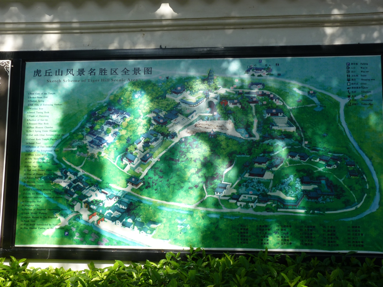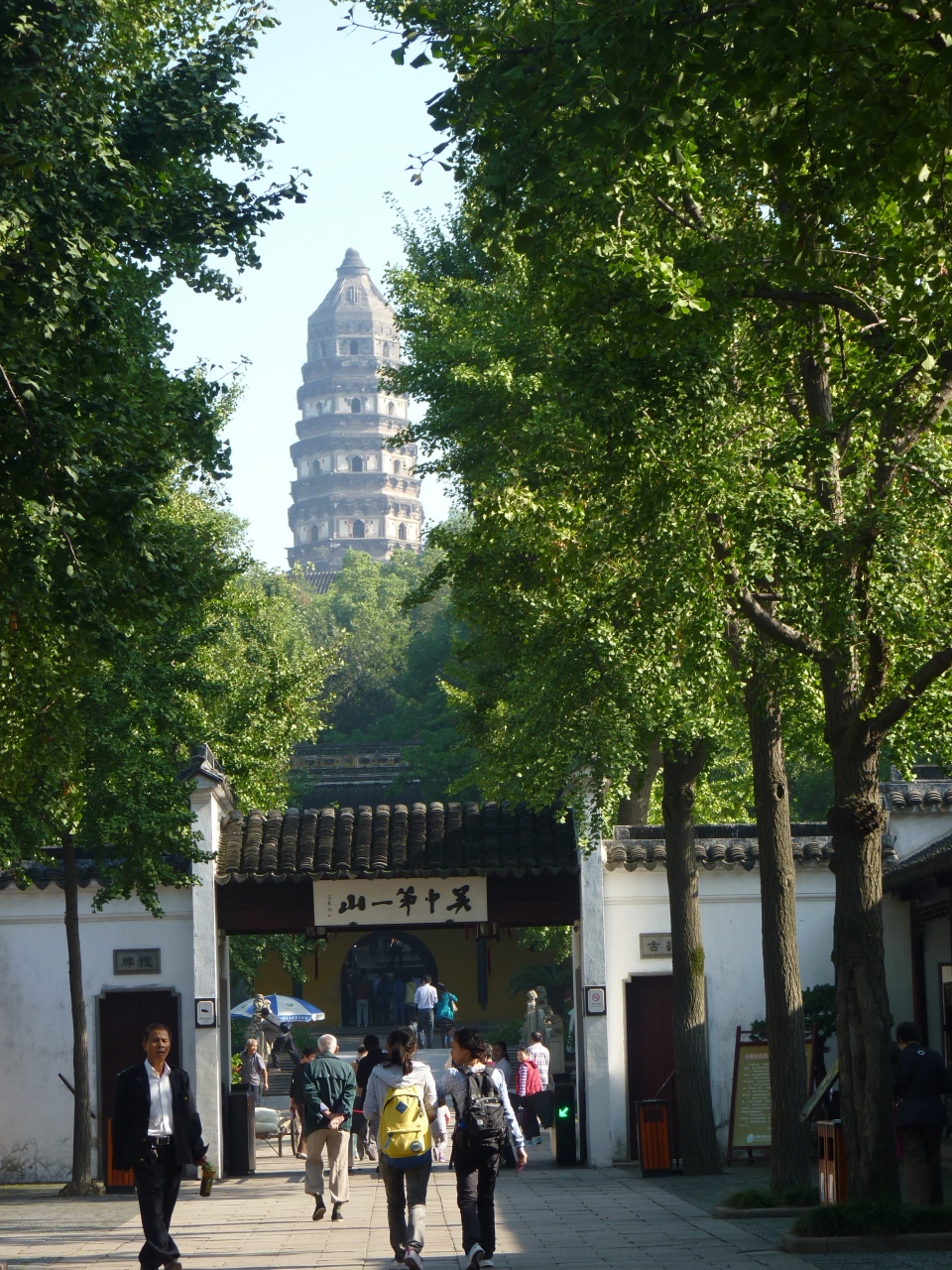 小高い丘の上にあり、呉王の墓といわれており門をくぐると、奥に雲岩寺塔(虎丘塔)が見えてくる。よく見ると少し傾いているように見えるが、ピサ程でない。木々の間から見える塔は圧巻で、両側にはいくつかの建物(山荘)や古井戸、石群が散在しているが良くわからない。