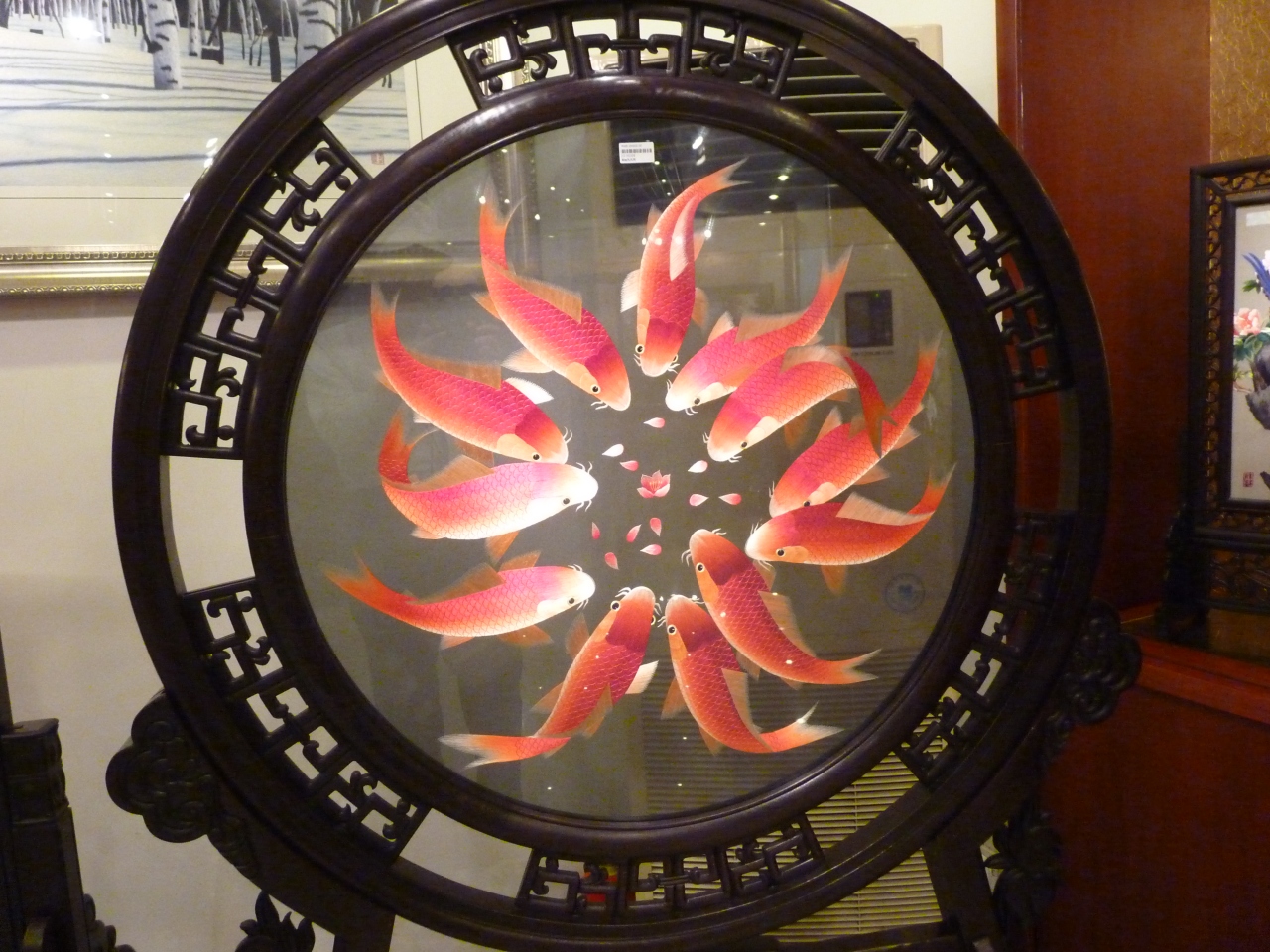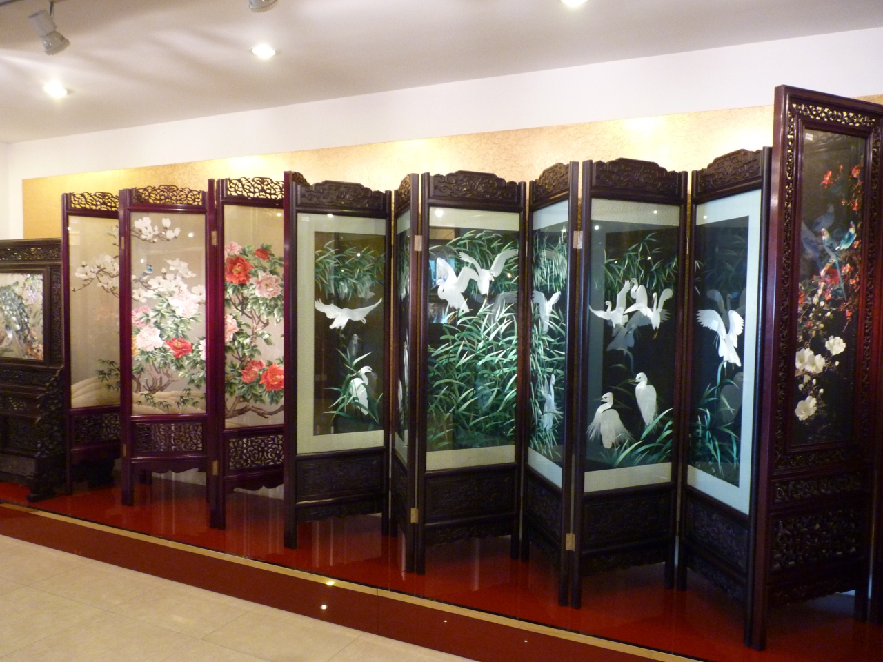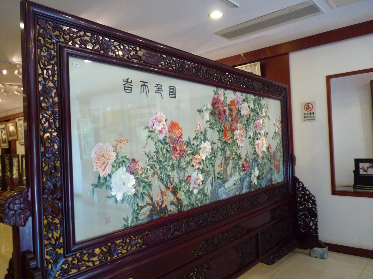 この研究所は、世界遺産に登録されていると聞いて驚く。環秀山荘という庭園内にあり広大な敷地内にあるので、ゆっくりと見て回るとかなり時間がかかるので、とりあえず刺繍を見学する。特に両面刺繍はその規模の大きさに圧倒される。一刺し一刺しの作業は必見の価値がある。館内にはお土産品も含め、所狭しと展示されておりすばらしい。特別の許可を得、撮影した。