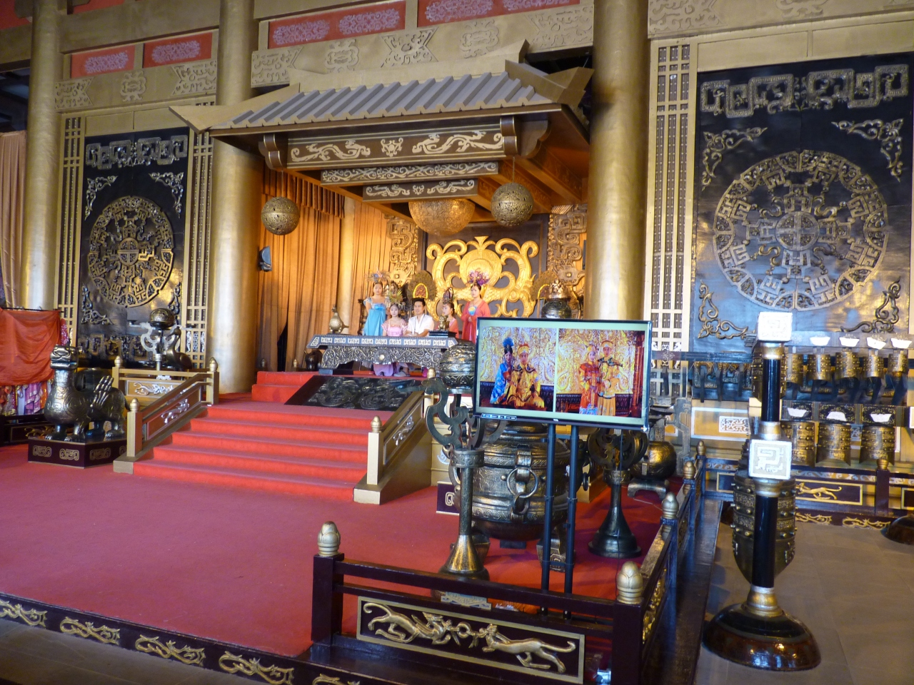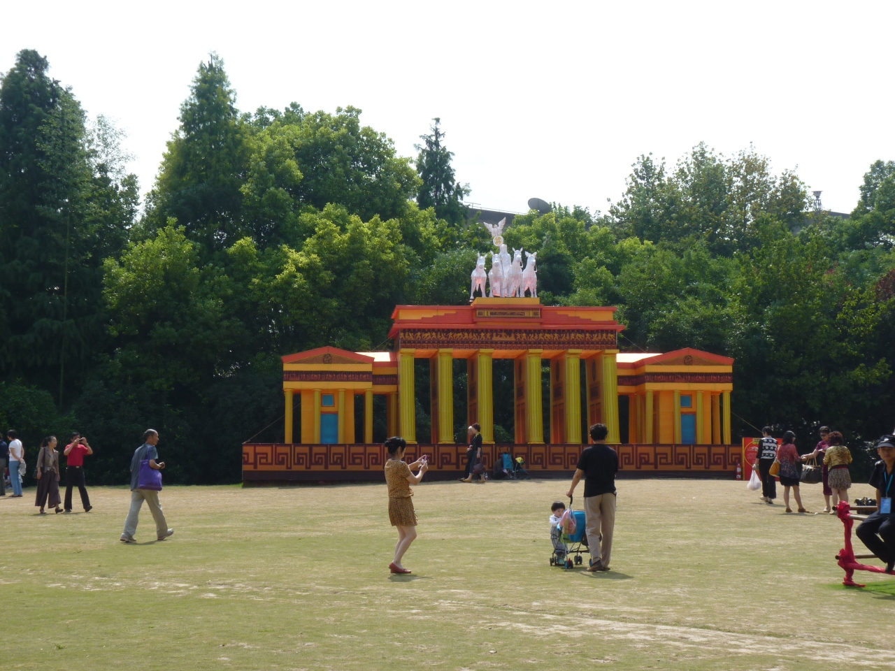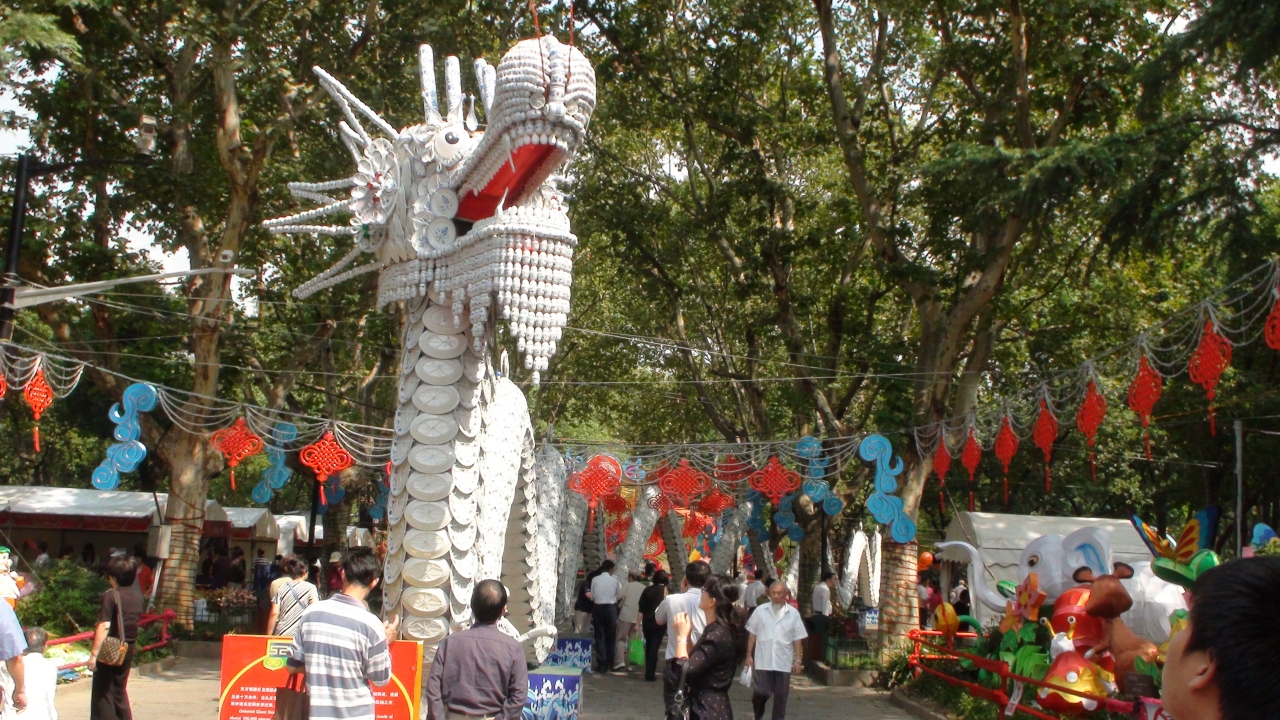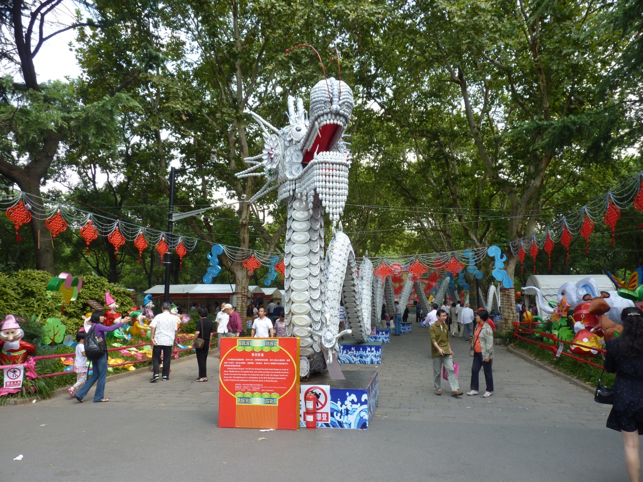 たまたま訪れたときは、世界の建物の展示会や、皿で作った竜の展示が公園内で開かれており多くの中国人たちの家族ずれが楽しんでいた。我々から見ると少しちゃちな材料でけばけばしく彩りした世界各国の建物を見るのも中国人らしいと感じた。しかし小皿で作った竜の飾りは面白い
