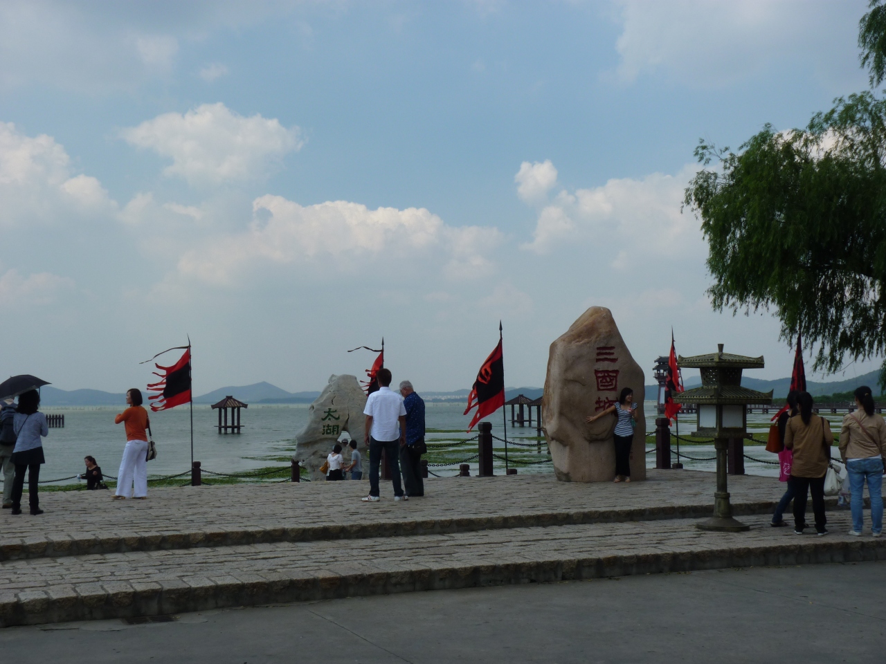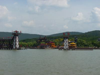 テーマパーク三国城公園の正門をくぐる戸公園の中は広く、ロケ地跡を見ながら公園を散歩していると、船着場に着く。昔風のクルーズ船に見立てた観光船が何艘も浮かんでおり,どれも観光客で一杯!(中国人ばかり・・・)時間は、大湖内を30分ばかり遊覧するだけで、すし詰めの船の中で小さくなっていた。
