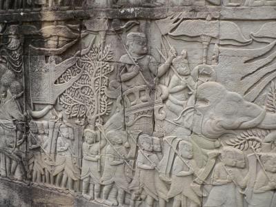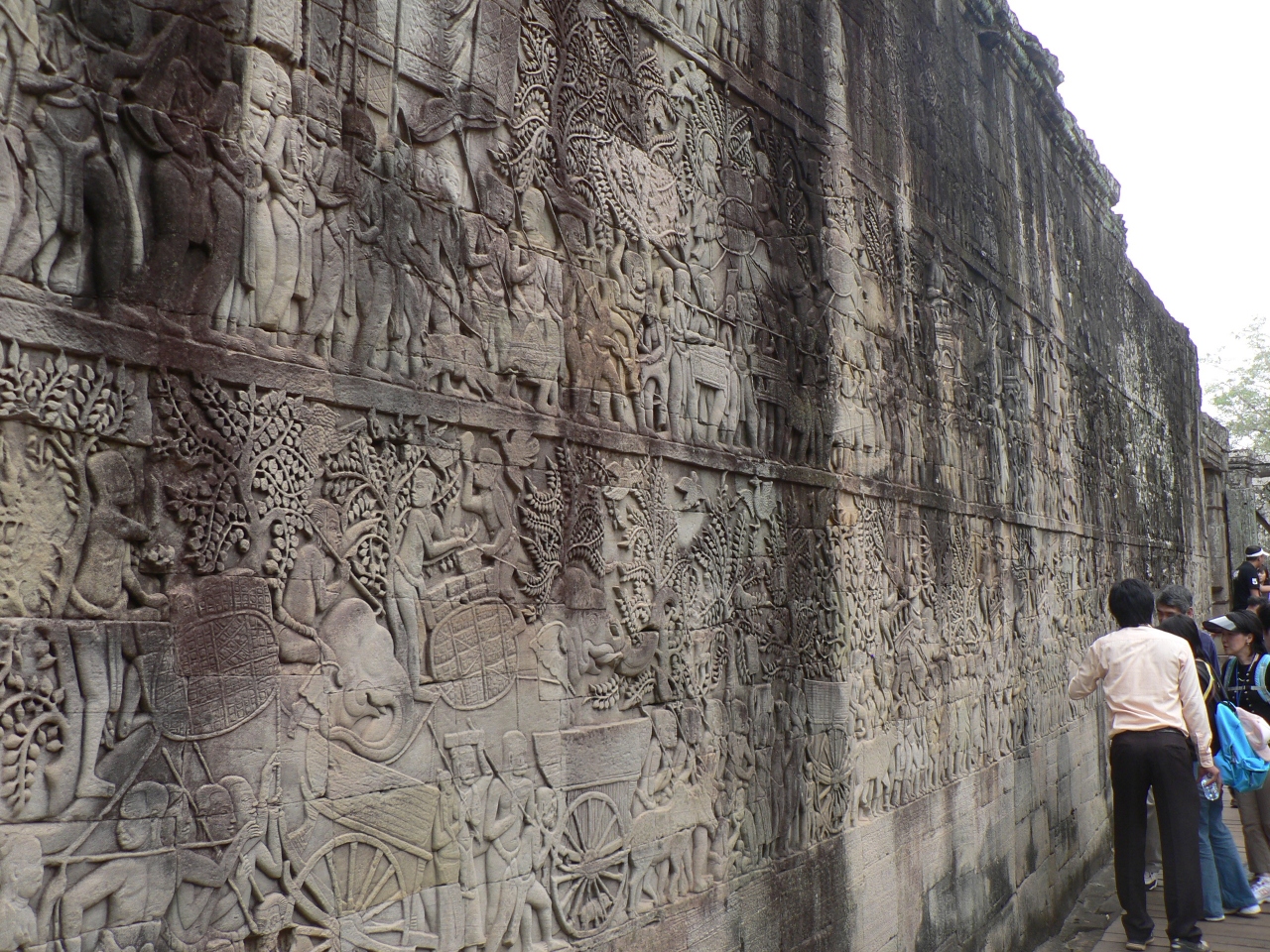 高く聳える(41m)バイヨン中央本殿には、王を神格化した像が祀られているがその彫刻は実に見事なものでしばし見とれる。特に回廊に画かれたレリーフは必見でクメール人の生活や宗教慣習をテーマにしたレリーフが数多く見られる。