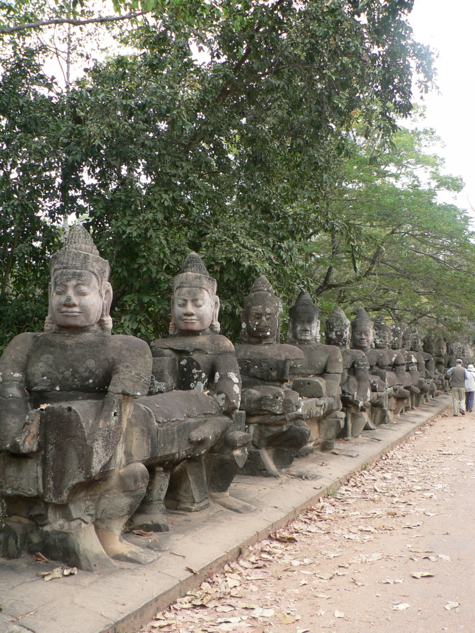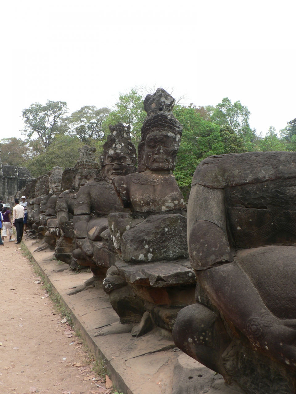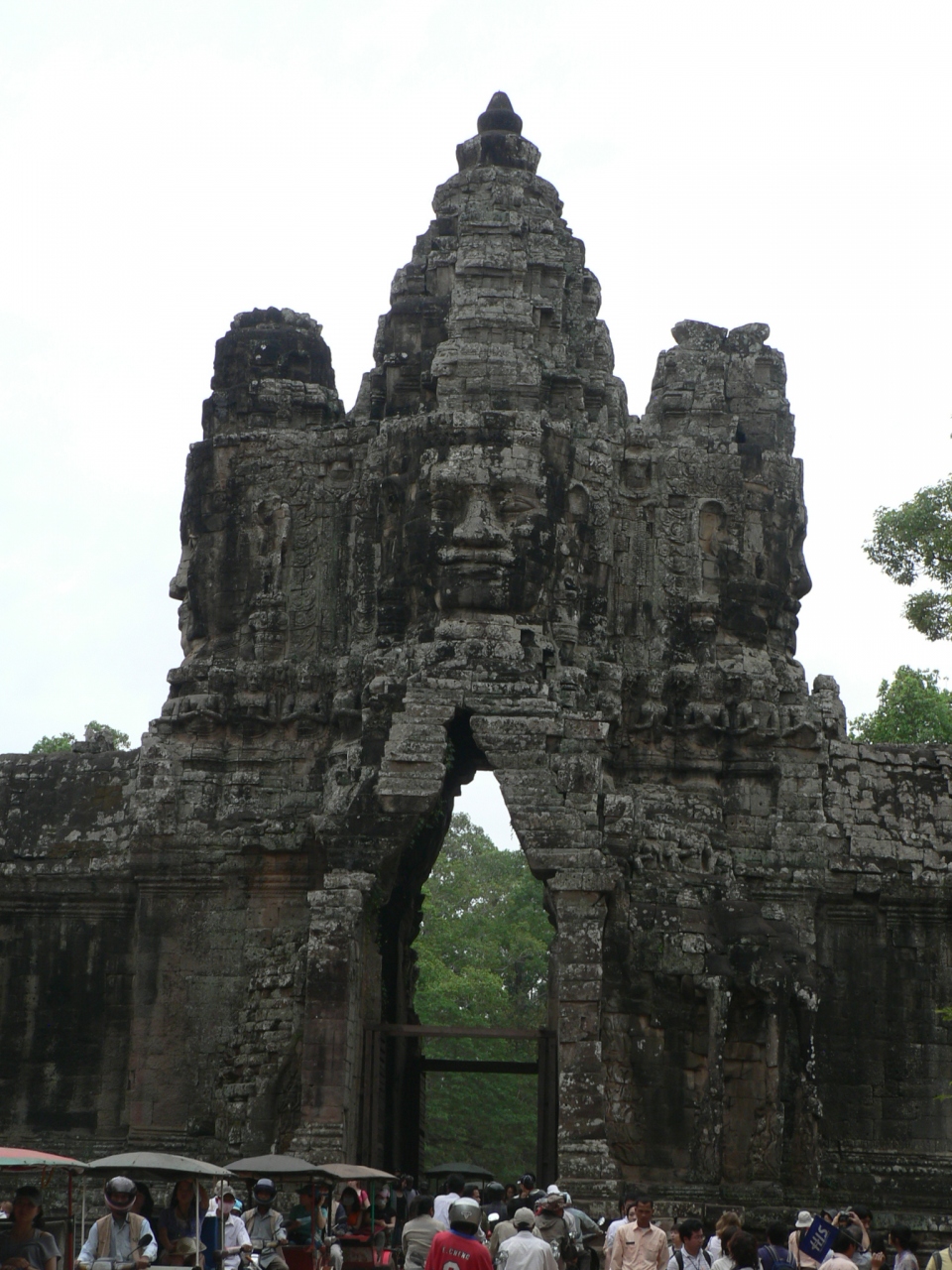 最盛期の都城の入り口の一つで、5つの門があリ、正面から入る門で入り口の右側には54体の阿修羅像が、左側には同じく54体の神々が座禅を組んで座っている姿か壮観で、まず撮影のポイントになる。門の上には巨大な四面仏が歓迎して微笑んでいるように見える。