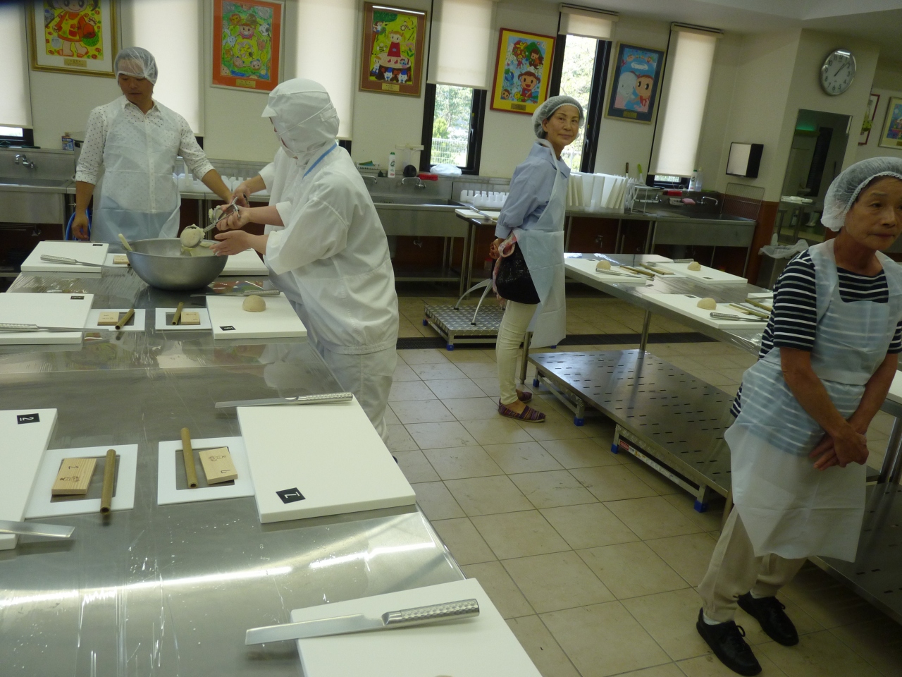 夢前川を上へと車を走らせると、大きな看板が立っている。そこを右へ入ってゆくと蟹の爪をした看板が目に入り、そのまま進むと駐車場です。受付で蒲鉾、竹輪の体験学習に申し込み同時に工場見学も出来る。夏場は午前と午後2回開催しているようです。早速冷房の効いている教室で従業員さんの講習を受けながら見様見真似での体験です。子供たちには参考になると思う。出来上がったのをその場で焼いてもらい、お土産として持ち帰ります。