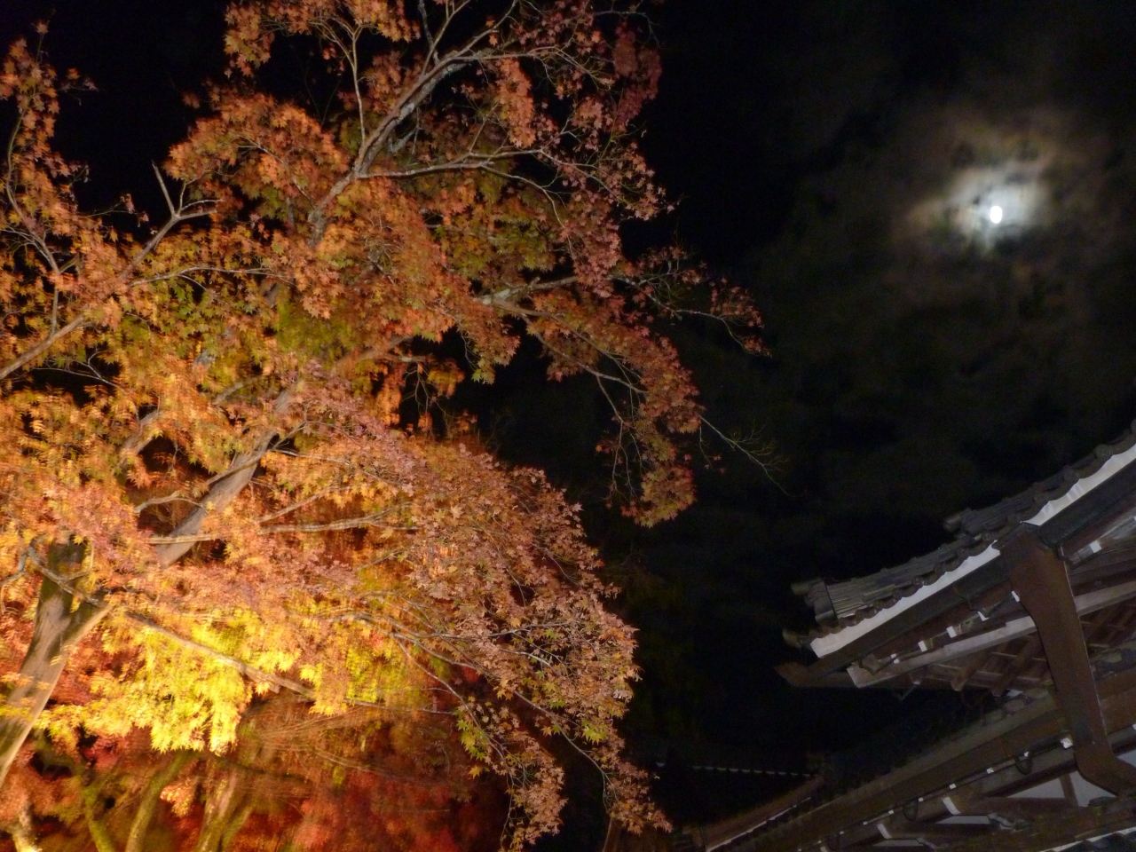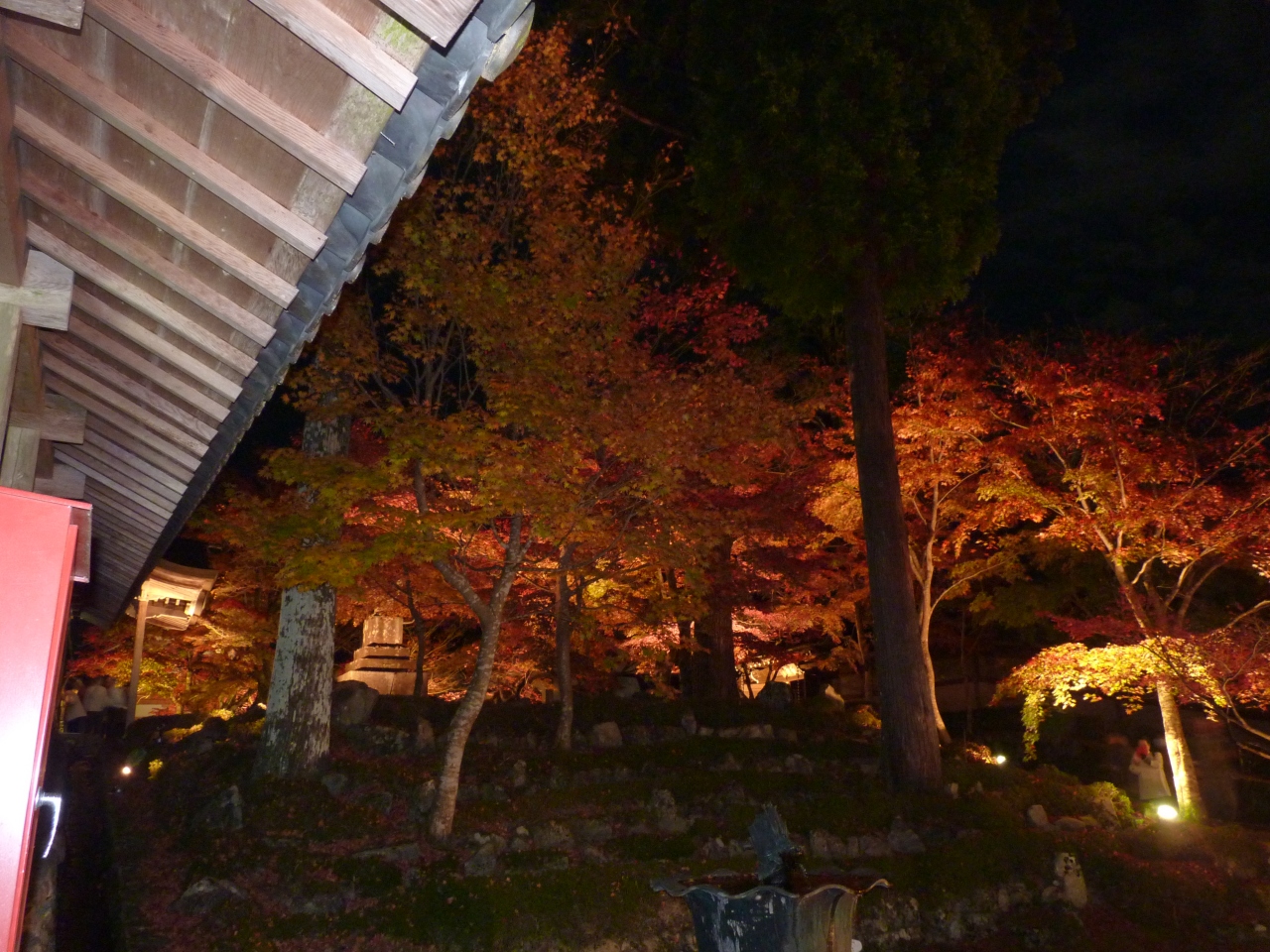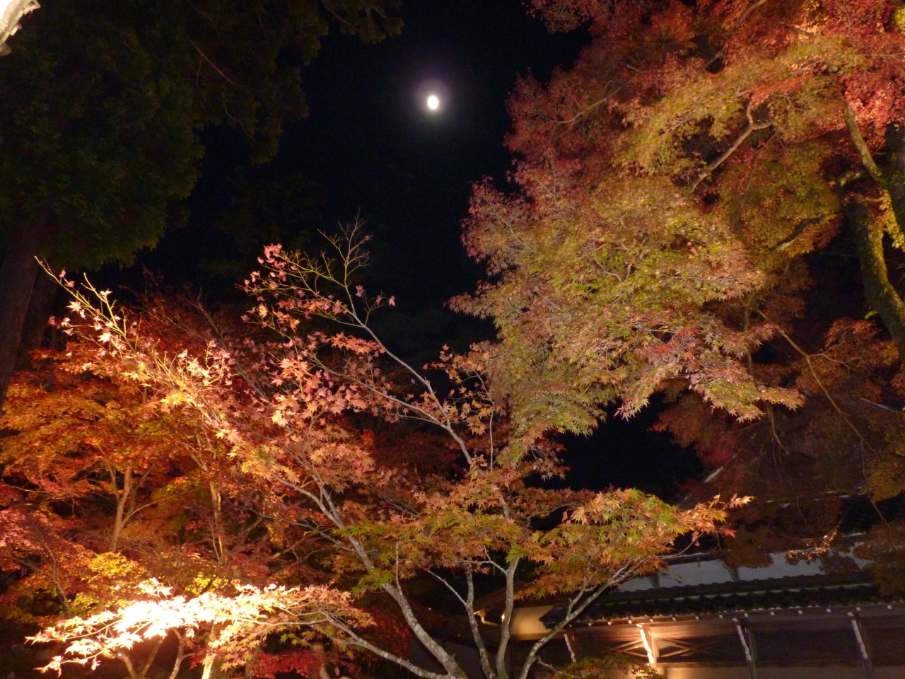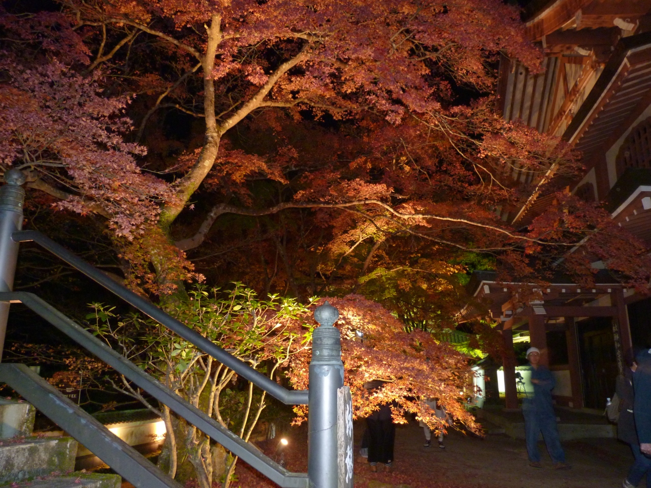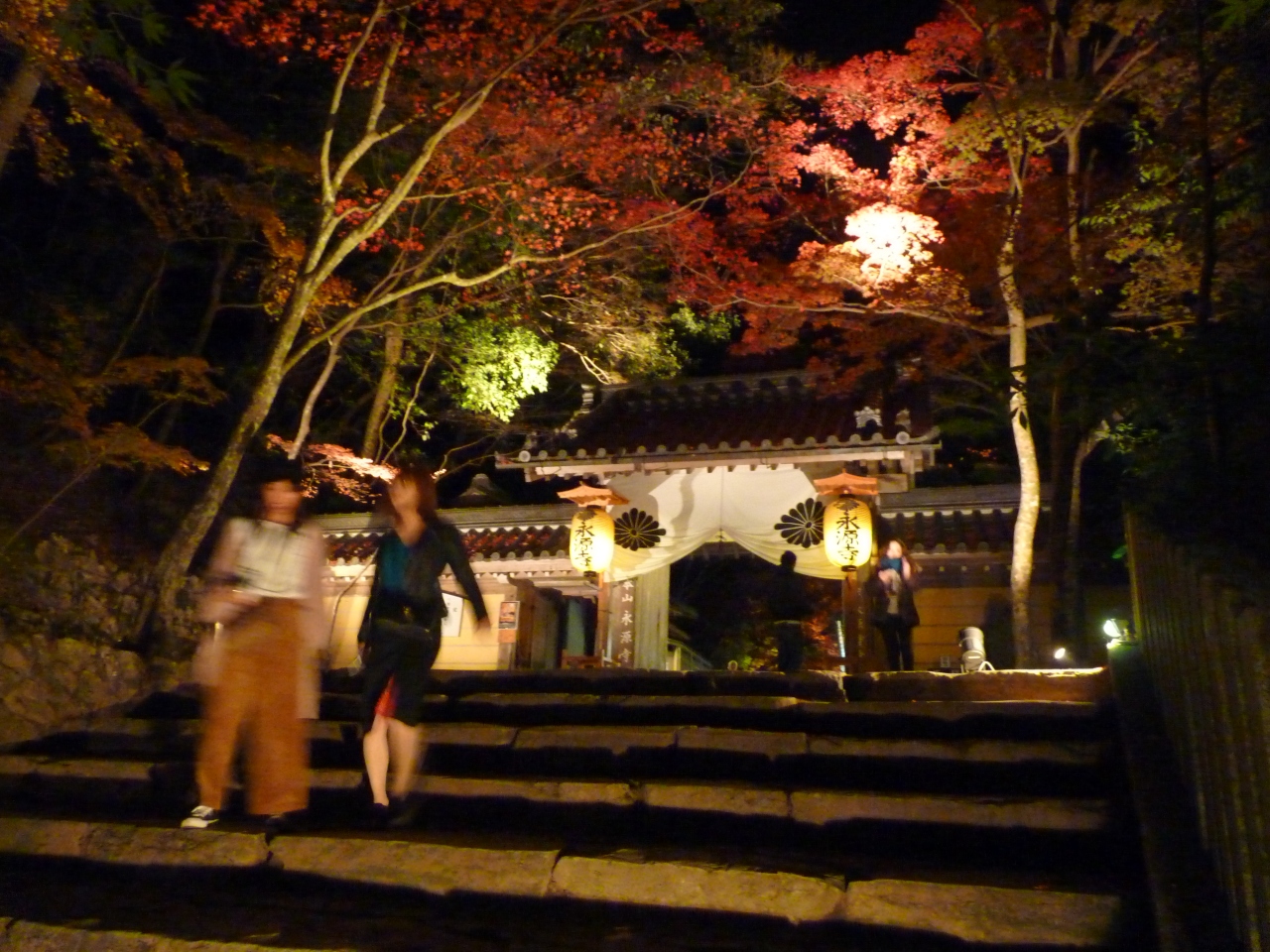 ここのライトアップはPM5頃からということで6時くらいに入ると、すでに多くの観光客で賑わっていた。橋を渡り、のぼりになっている階段を進むと山門が見えてくる。ここで拝観料を払い入門すると、目の前にはまばゆいばかりに紅葉した紅葉がライトアップされ輝きを醸している。ちょうど見ごろで月夜の紅葉観賞となった。