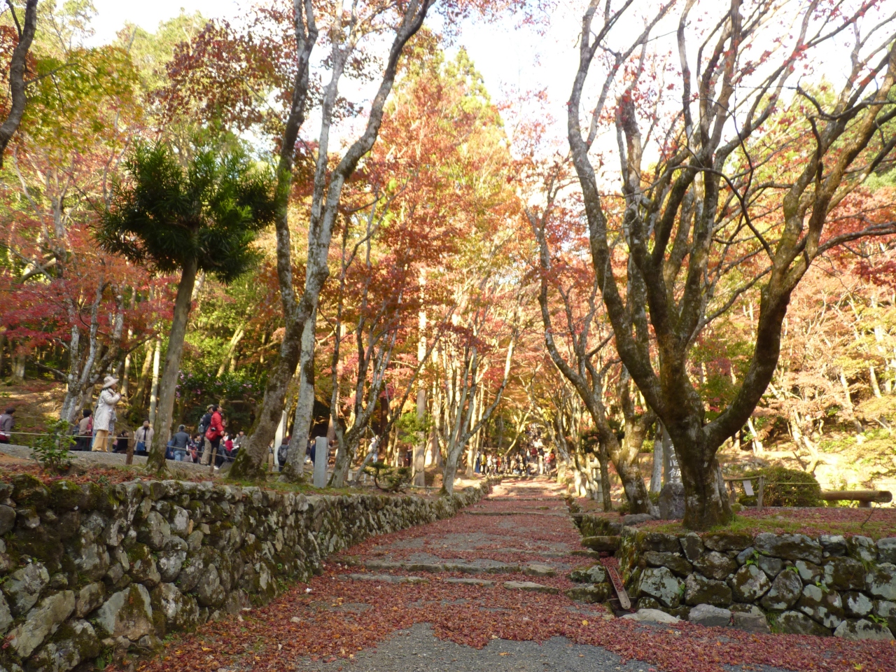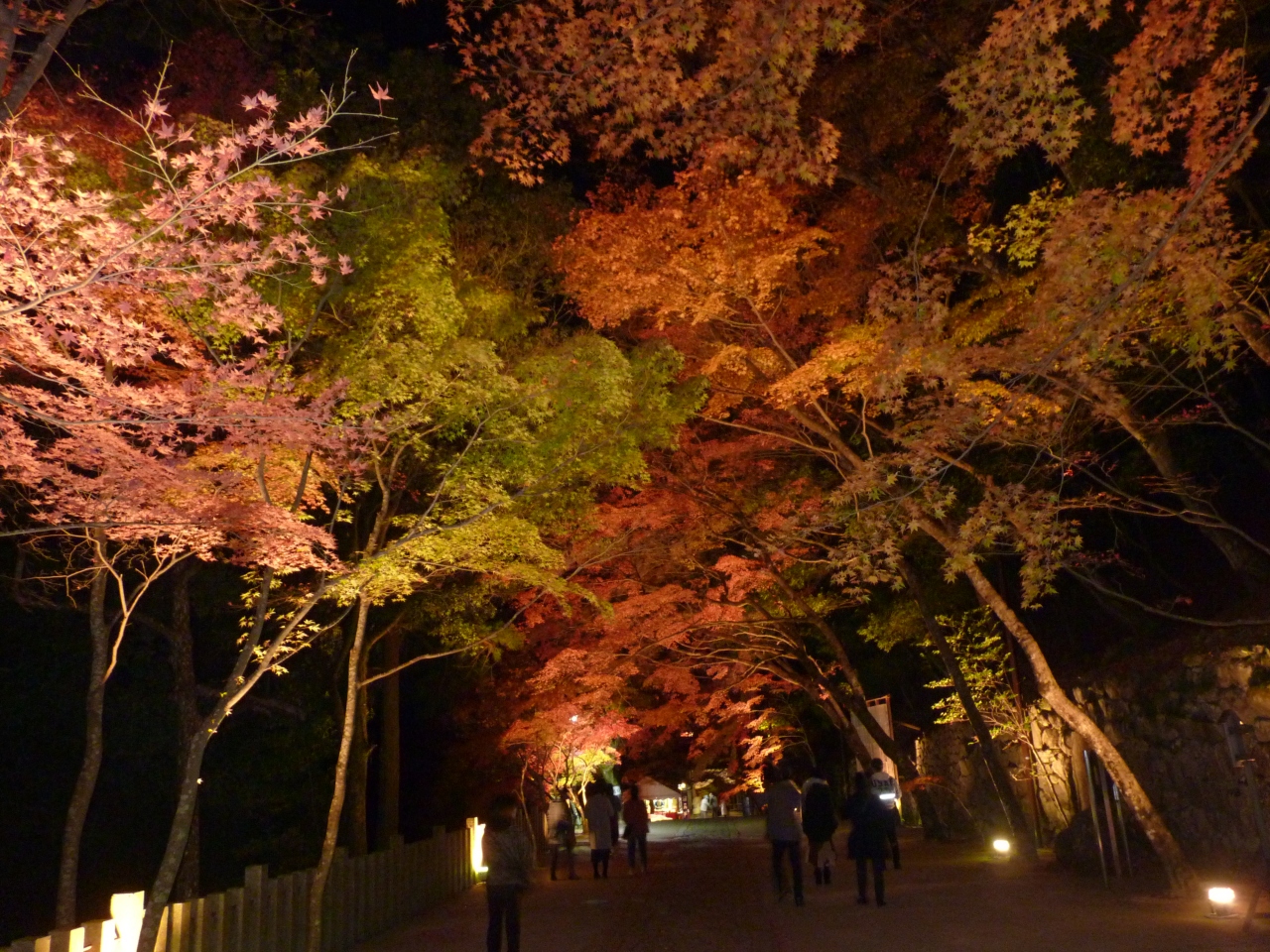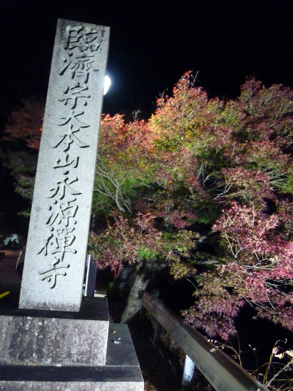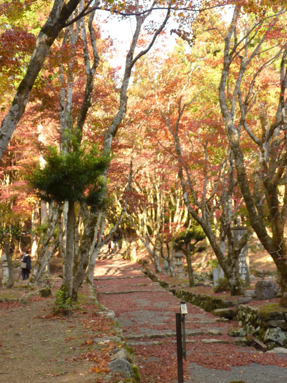 ここのライトアップはPM5頃からということで6時くらいに入ると、すでに多くの観光客で賑わっていた。橋を渡り、のぼりになっている階段を進むと山門が見えてくる。ここで拝観料を払い入門すると、目の前にはまばゆいばかりに紅葉した紅葉がライトアップされ輝きを醸している。ちょうど見ごろで月夜の紅葉観賞となった。