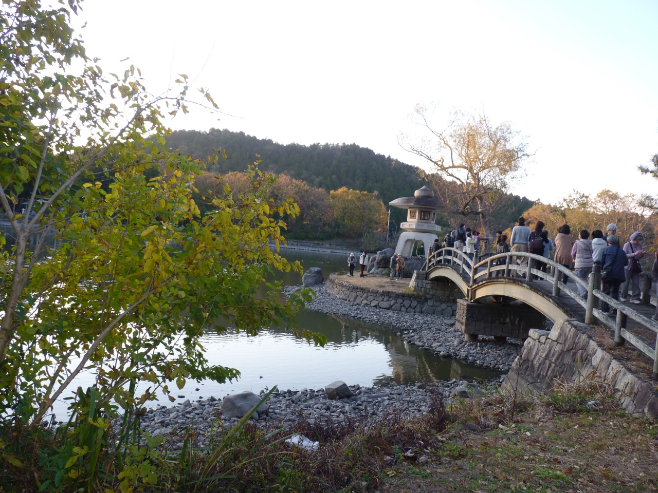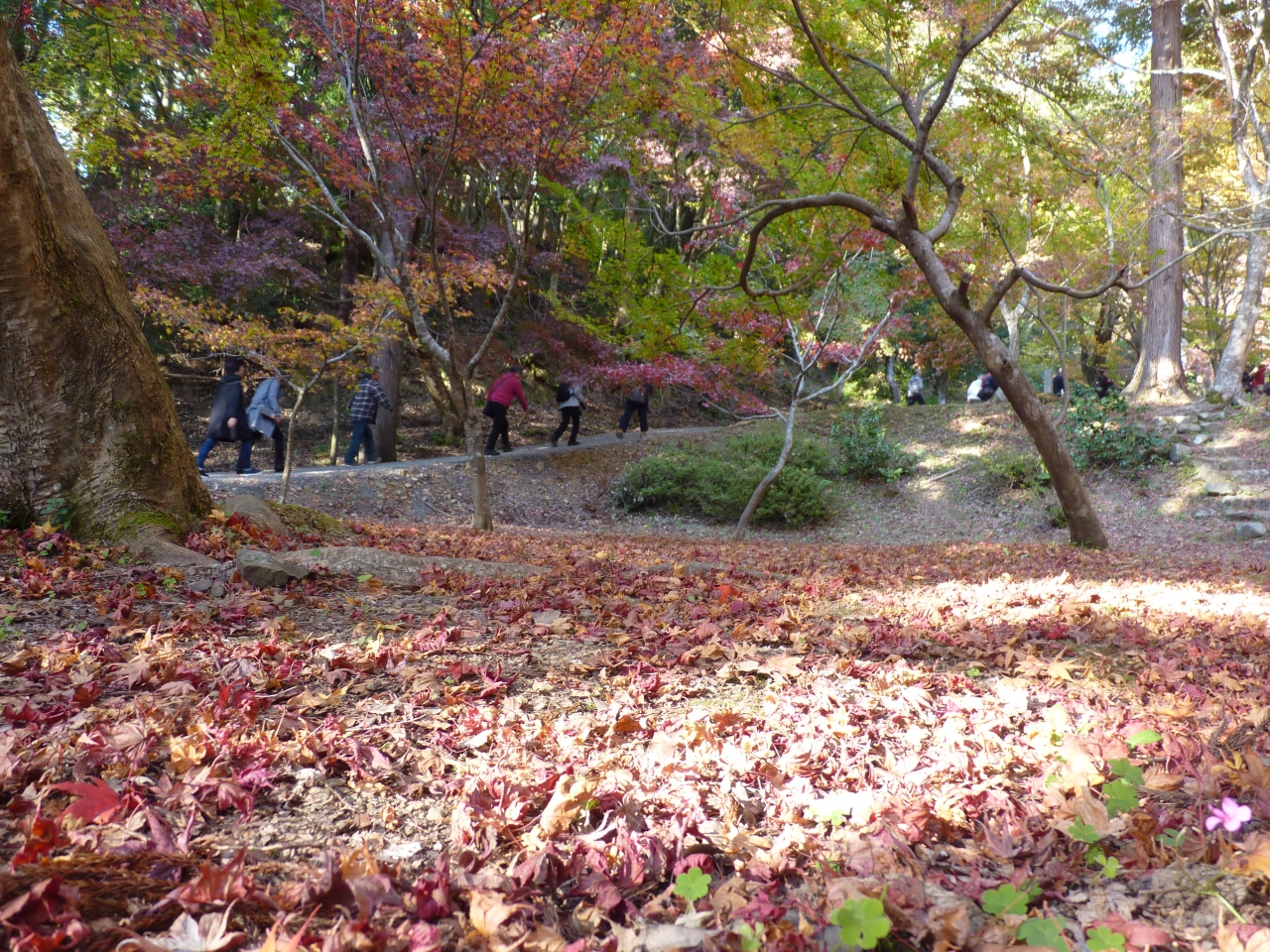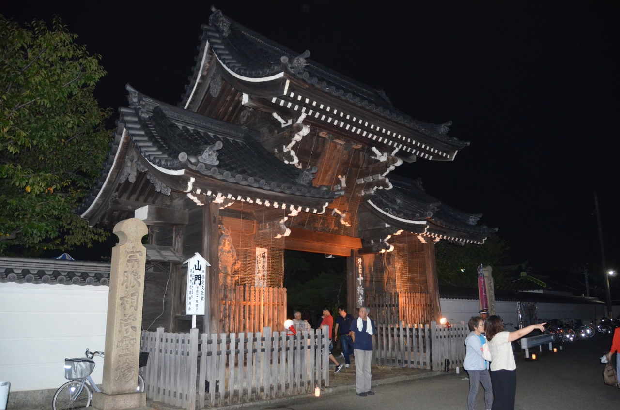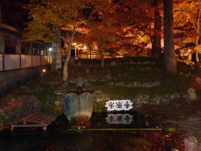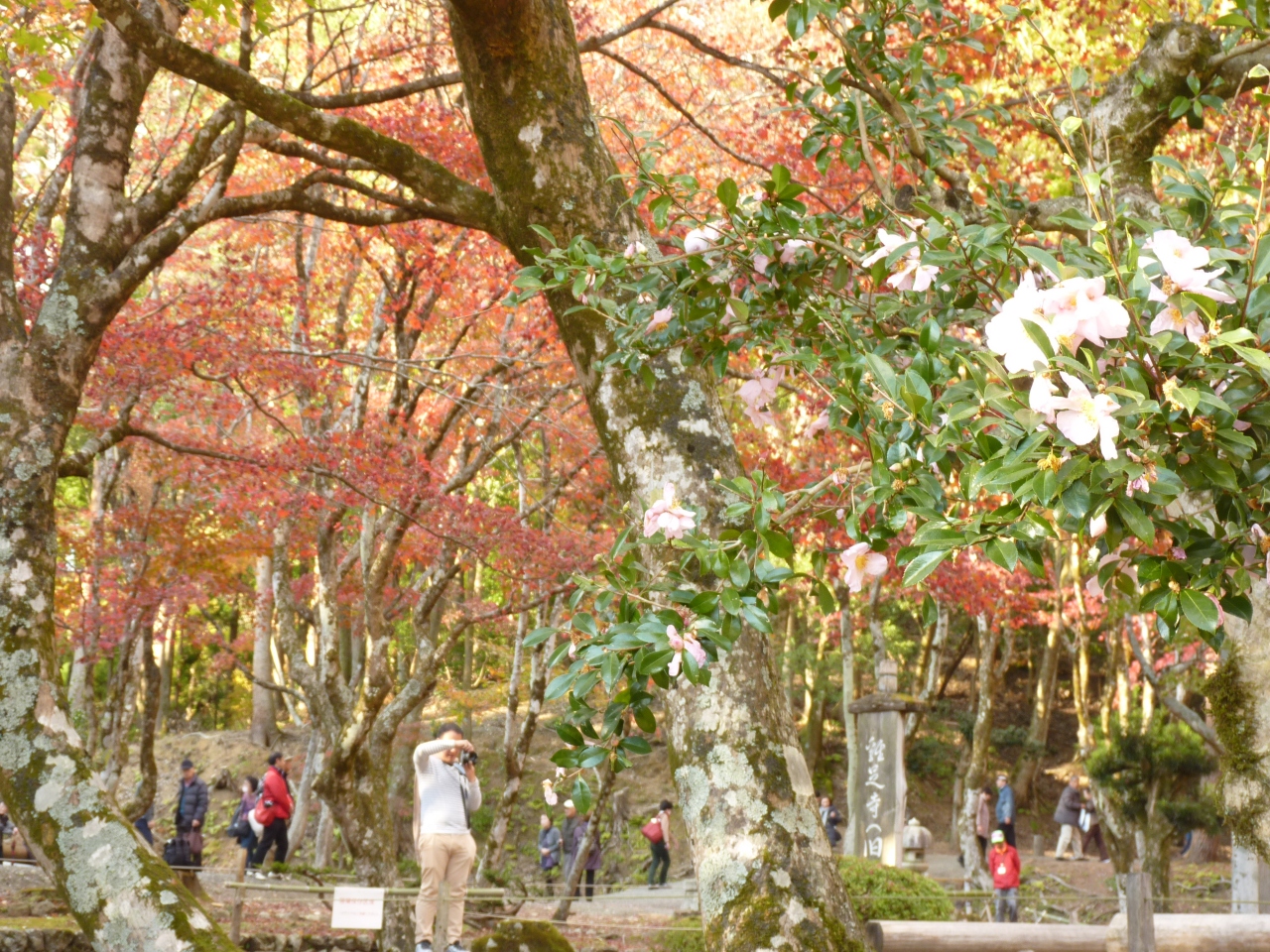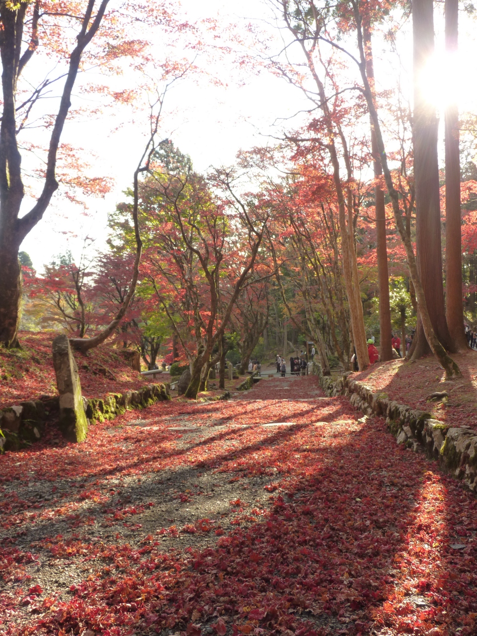 ここのライトアップはPM5頃からということで6時くらいに入ると、すでに多くの観光客で賑わっていた。橋を渡り、のぼりになっている階段を進むと山門が見えてくる。ここで拝観料を払い入門すると、目の前にはまばゆいばかりに紅葉した紅葉がライトアップされ輝きを醸している。ちょうど見ごろで月夜の紅葉観賞となった。
