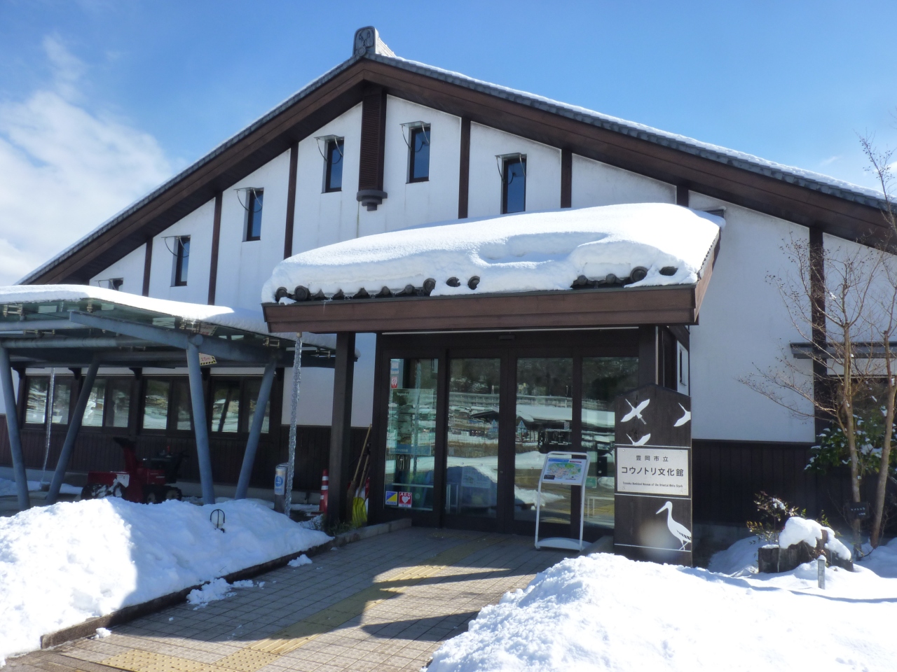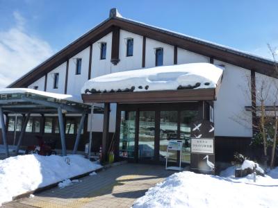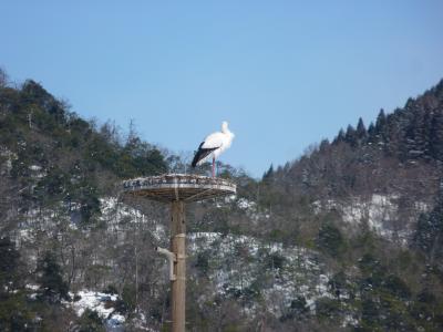 広大な田んぼの中に県の施設のこうのとり館がある。入場料は一応無料です。入り口を入ると剥製のコウノトリが迎えてくれる。窓際に2台の双眼鏡が備えてあり自由にコウノトリの巣造りを観賞できる。ちょうど2月ごろから産卵期に入るようで人口鉄柱上では、枯れ枝を運び巣作りしているシーンを見ることが出来た。