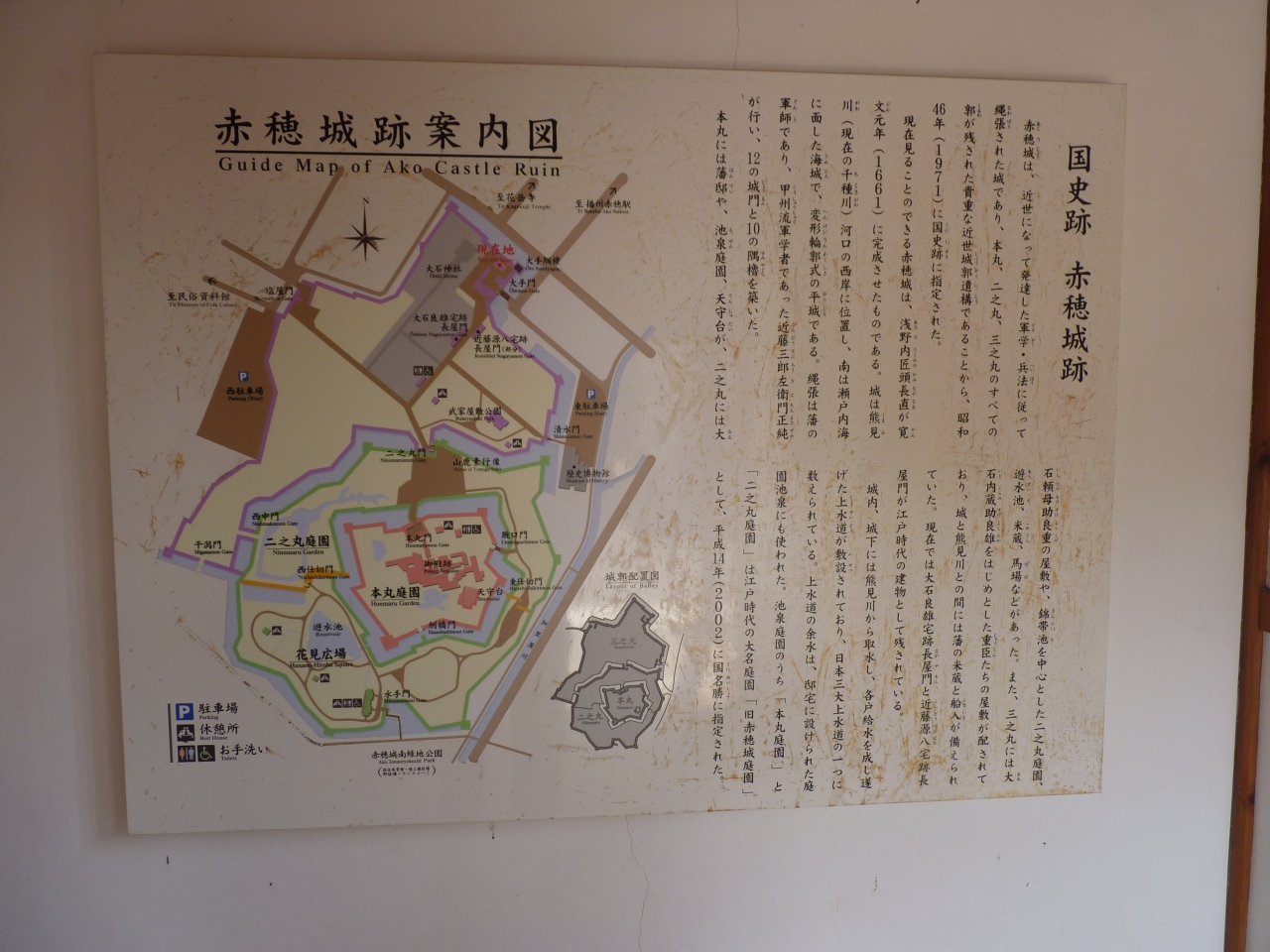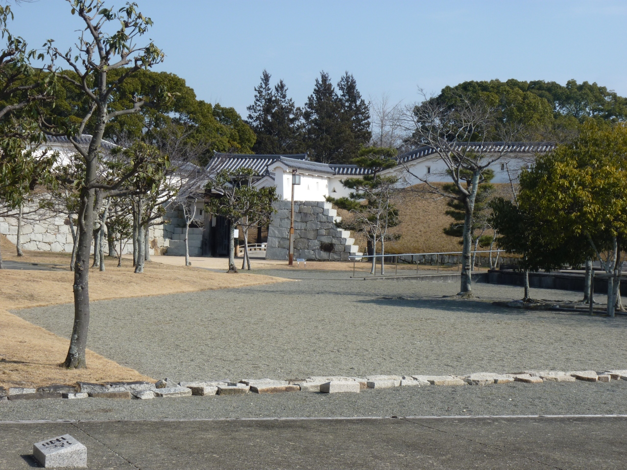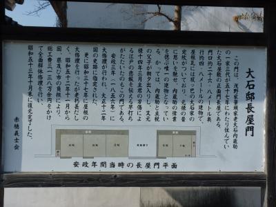 大手門を潜り、今は石垣だけが残っている場内を案内表に従い進むと長屋のような建物が目に付く。この屋敷は当時の姿をそのままとどめており、一部庭も残されているようだが外から見ることが出来ない。当時、この屋敷の中で内蔵助がどのような心境でいたかを想像しながら屋敷を後にする