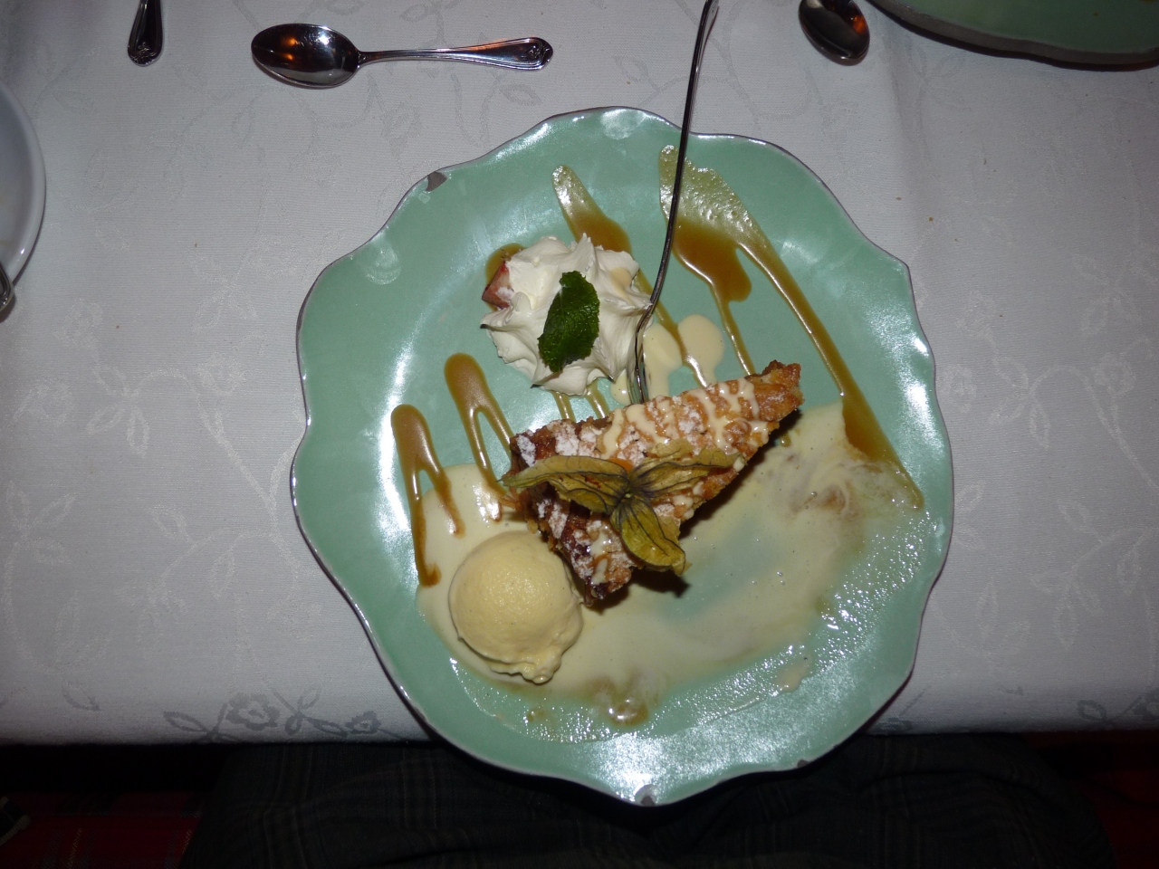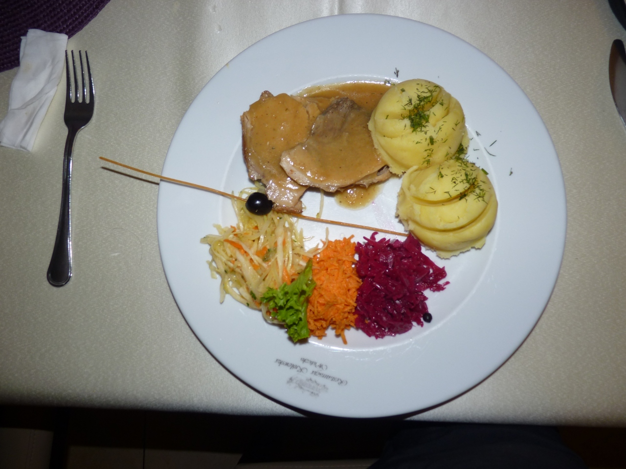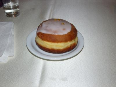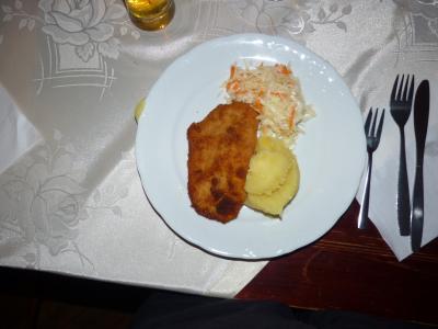 午前中に岩塩抗観光を済ませ,お腹が丁度空くときに、道を隔てて公園を横切り少し上ったところに瀟洒なビルの中にある。ここでポーランドの郷土料理を田舎で食するのもよい。デザートはポーランド風ドーナツ・ポンチキ、メインはチキンのソテー、前菜はチーズ入り野菜日本人の口に合いました。