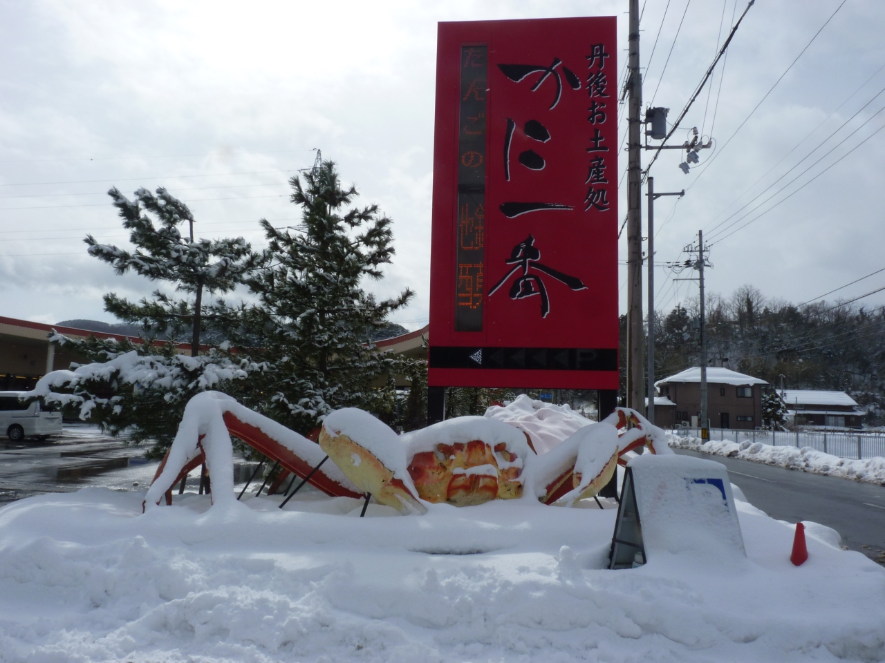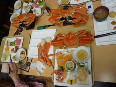 夕日が浦温泉から網野駅に向かう角にあり、入り口にジャンボかにが迎えてくれる。珍らしさに立ち寄ってみると、入り口には足湯があったが、さすが冬場は誰も入らないのかやっていなかった。さすがシーズンだけあって松葉ガニがずらりと並び賑わっていた。