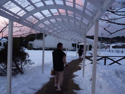 網野市内より少し奥には行った道筋にあり、べいじゅ色した洋館ホテルなのですぐにわかる。水辺のホテルで野鳥などの飛来も部屋の窓から楽しめる。この時期は雪が深く心配したが道は絶えず除雪しているので車で行けた。ここのメニューは色々ちょっとづつ食べたい贅沢料理が売り物で、丹波で取れる魚介、但馬牛、かに等をイタリアン風にしたコースで、味もおいしかった。風呂場も雪見の露天風呂もこのシーズンのみの風景で満喫できた。