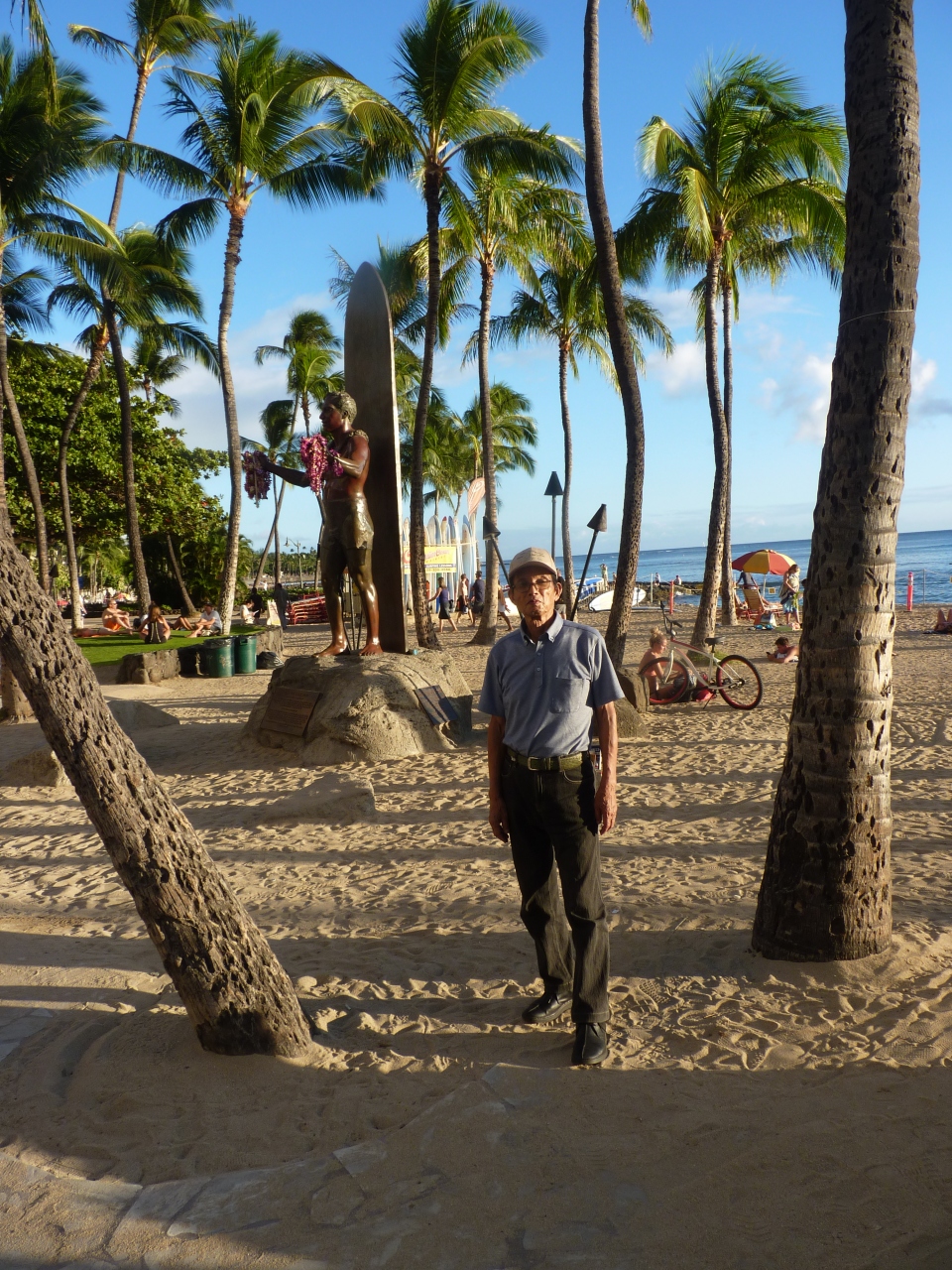 ワイキキビーチのほぼ中心にありいつも記念写真を撮っている風景に出会わすのですぐにわかる。背後にサーフインボードがあり、いかにもハワイアンスポットのひとつになっている。夜になるとすぐ近くのステージでハワイアンダンスショーも開かれていて、遅くまでにぎわっている