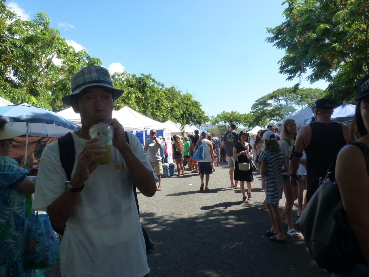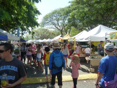 ダイヤモンドヘッドより下山の途中に、道を介して毎週土曜日のみオープンする島最大のマーケットに立ち寄った。ココは島のローカルフードや食品、花など人気の屋台が結集している。ハワイ産のフルーツもずらり並びその場で味わえる。