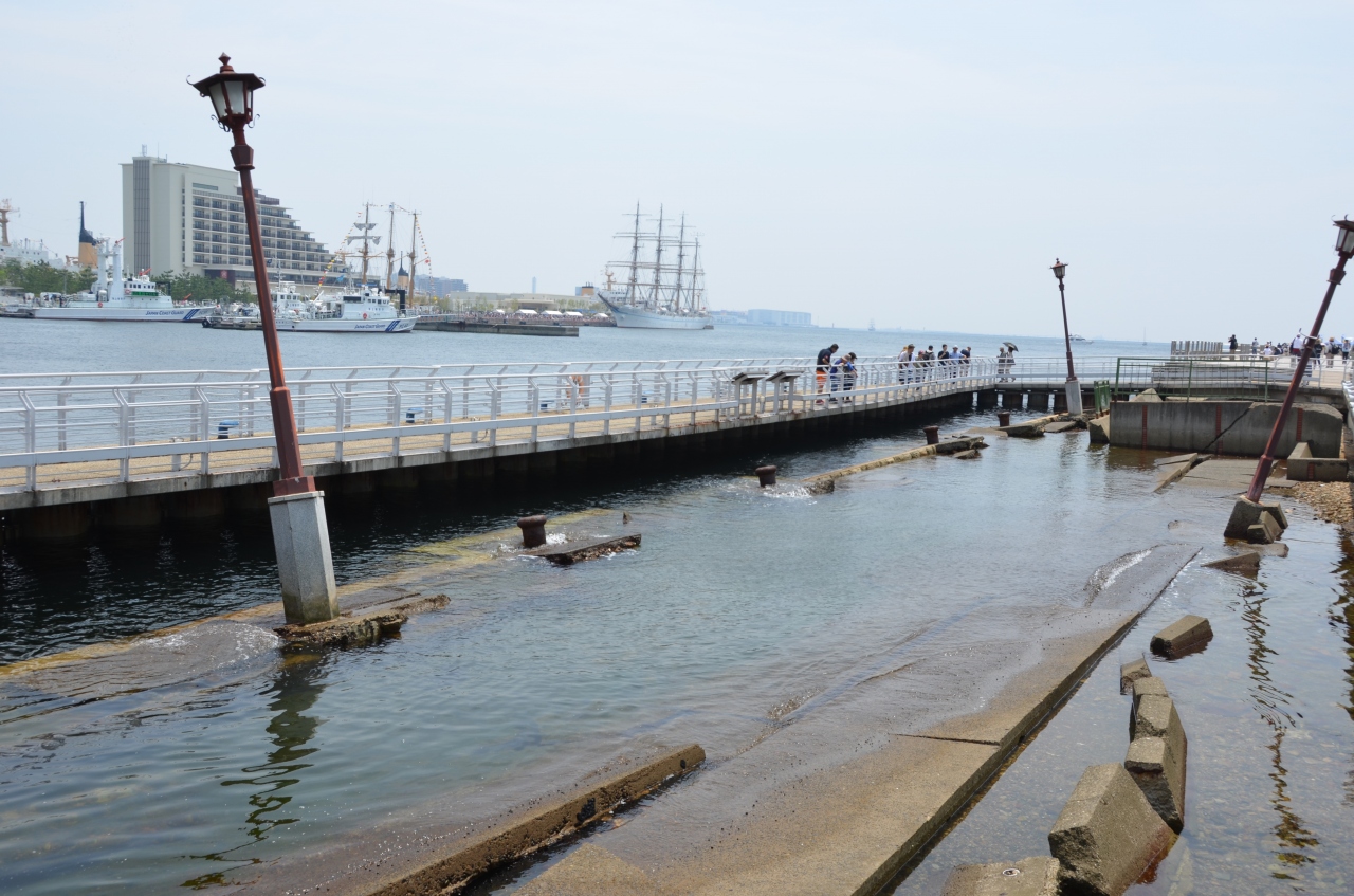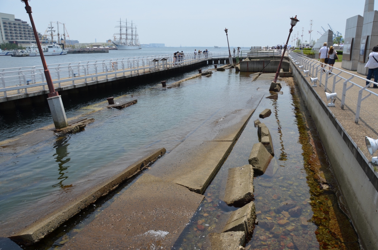 JR元町駅を下車して南へ徒歩で約15分ほど歩くと、メリケンパーク入り口に着く。入り口から少し港に入るとメモリーパークとして当時の岸壁の崩れたままの姿を残した一部が保存されており、当時の悲惨さの写真等の説明がプレートにして残されている。