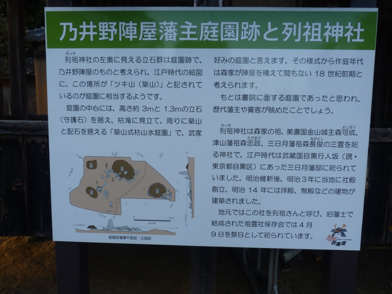 藩校の直ぐ横の少し坂道を上ると広場に出る。その右側にこじんまりとしたお社がポツンと建っている。土地の人に伺うとご神体は鏡です。明治3年に武蔵国からここに移したのが現社殿で、土地の人はこの宮を「列祖」さんと呼び大切に保存している。普段は中を見ることが出来ない。祭神は森三左衛門、森忠政、森長俊の三霊である。背面には森家歴代と本能寺の変で亡くなった森蘭丸兄弟の名を刻んだ木牒が置かれているらしく、たのむと