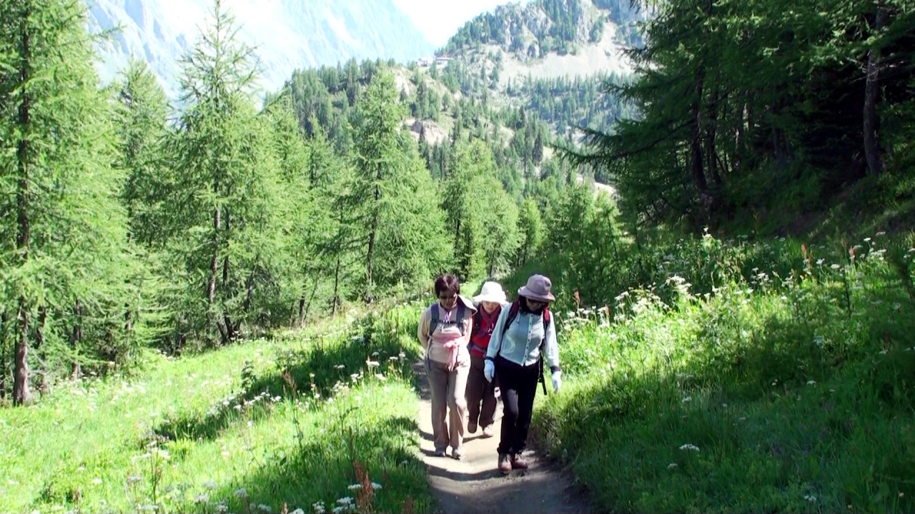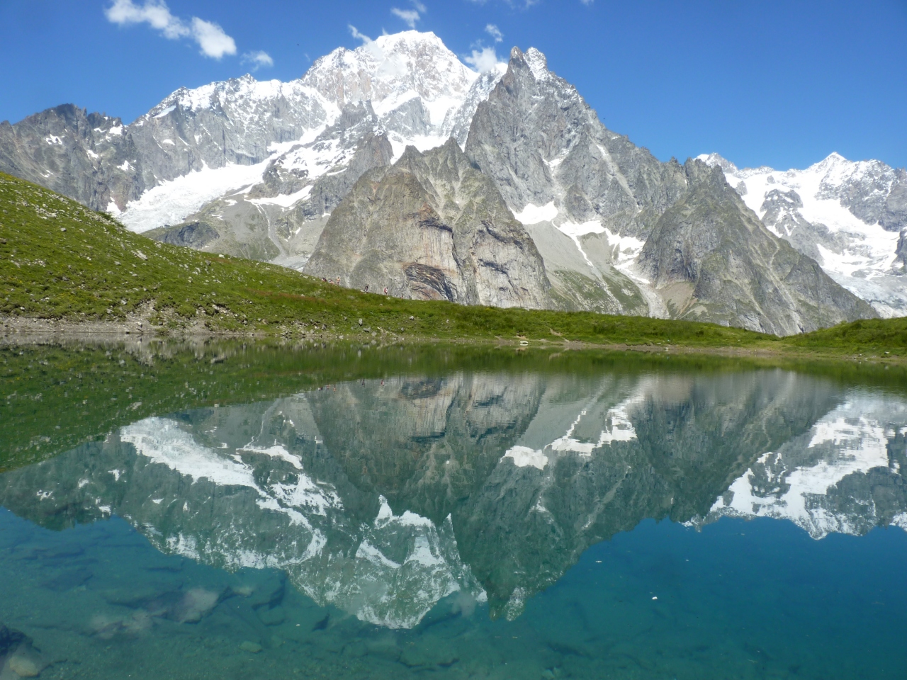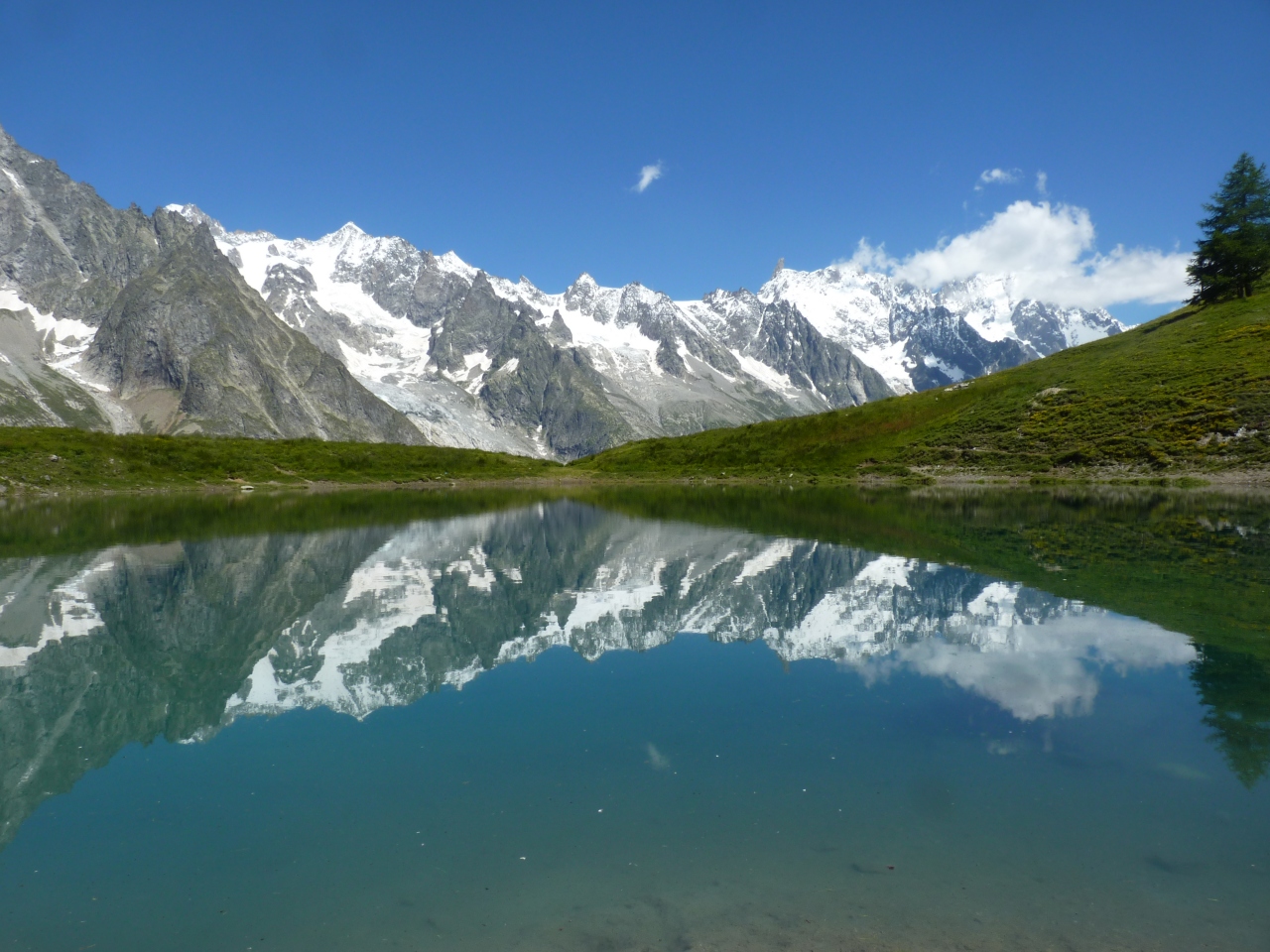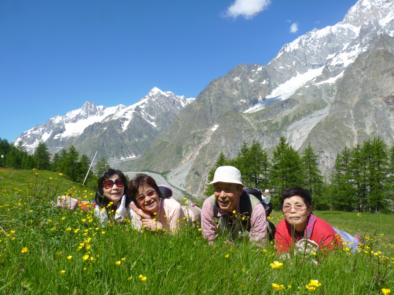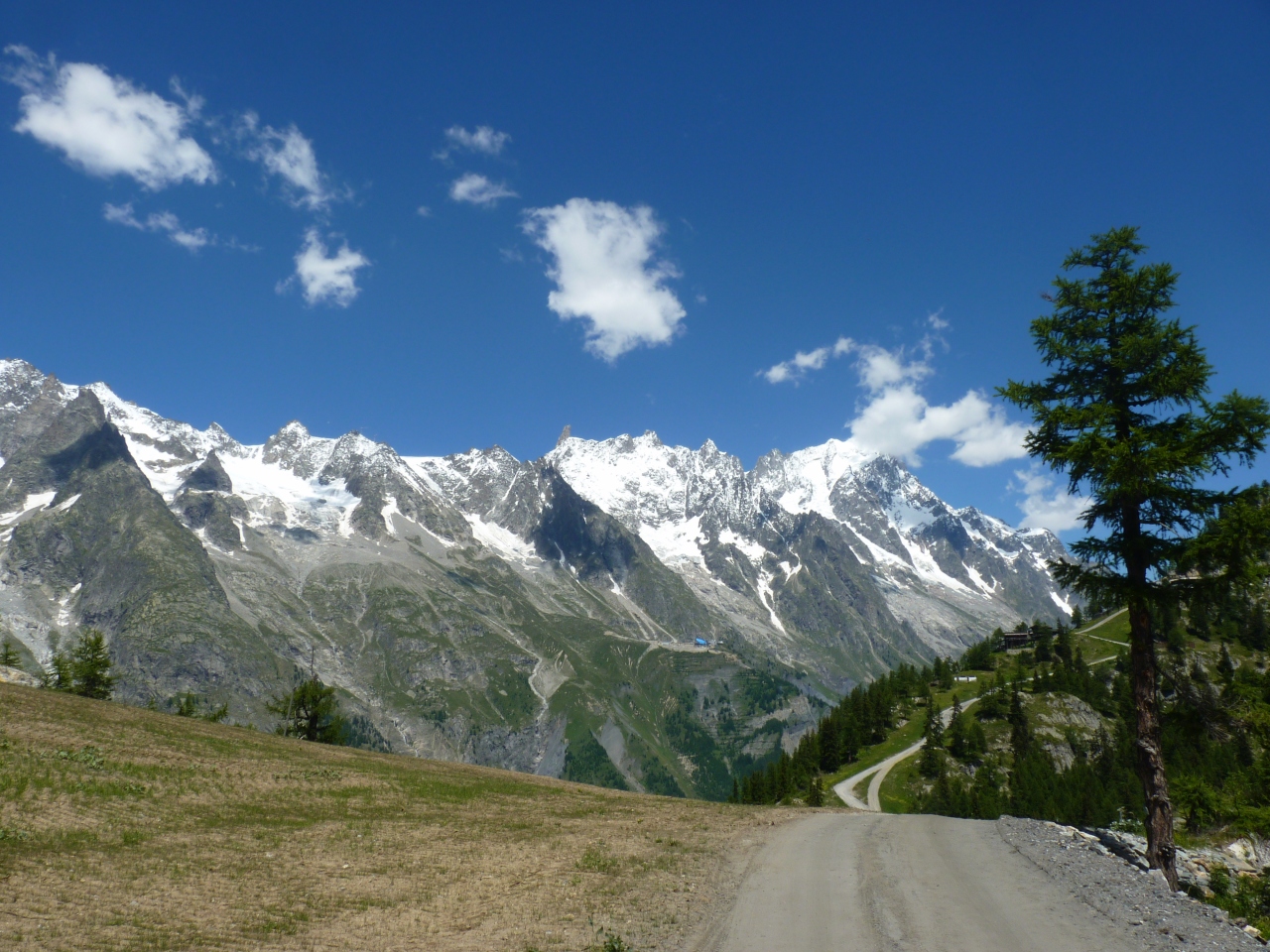 クールマイユールから135人乗りの大型ロープウエイでプランシュクレイへ行き、そこからトレッキングにはいる。緑の草原とお花畑が美しい気持ちのよいコース。コル・シュクレイまで来ると、今まで隠れていたモン・ブランがヴェニの谷を挟んで正面に現れる。巨大な岩山が聳え立つ男性的な景観が見られる。右手にはモン・ブランから流れる氷河が青白く輝き幻想的である。ここから道を左に折れ、ヴェニの谷に沿って斜面を斜めに登ってゆくと迫力のあるパノラマが広がる小さな湖ラーゴシュクレイが見えてくる。ここからはグランドジョラスにかけてのパノラマが広がり大迫力の眺めが見られる。