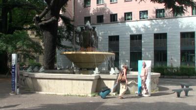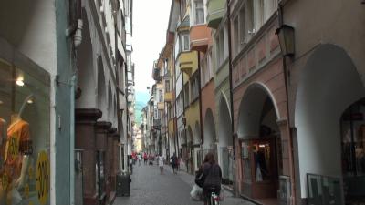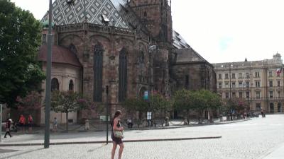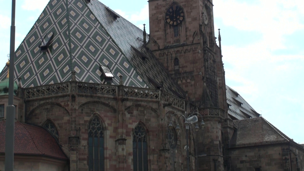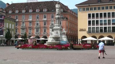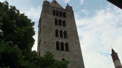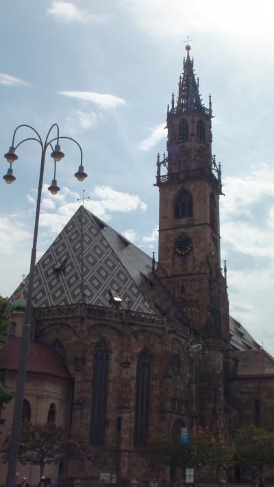 駅から緑の公園を通りまっすぐ歩くとヴァルター広場へと出る。其の直ぐそばに天を突くようにドウオモが聳えている。色タイルの屋根が非イタリア的な、ロマネスク・ゴシック様式の教会である。広場には、コーヒショップや土産店もあり、この広場は観光客で賑わっている