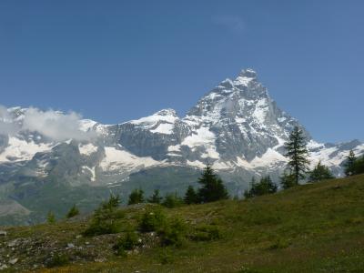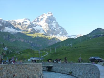 アオスタからはシャンティオンを経由して1時間30分くらいでチエルヴィニアに着く。終点は広い駐車場の先にある教会前の広場がバスの終点。2000メートルあり夏は放牧地になり、冬はスキー客で賑わい、観光関連の建物以外は少ない。ここからは、イタリア側からの登山基地としても知られている。