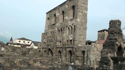 アオスタの街をp造ったのは初代ローマ皇帝アウグストスで、ローマの都市だった2000年前の姿をそのまま残している街といわれている。街を歩くといたるところに遺跡群が見られ、ローマと勘違いするほど綺麗に残っているのに驚いた。小さな町なので歩いてゆっくりと見学すればよい。