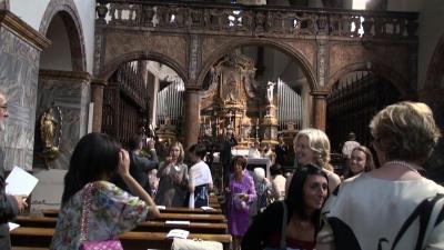 こじんまりとした街なので徒歩で充分回れる。この教会は凱旋門の通りが目抜き通りになっており、其の通りを西の方へ5分ほど歩き路地を北へ上がると尖がった塔が見えてくる。この教会には12世紀のロマネスク様式の修道院と回廊が残っている。ちょうどこの教会で結婚式に出会い祝福をした。