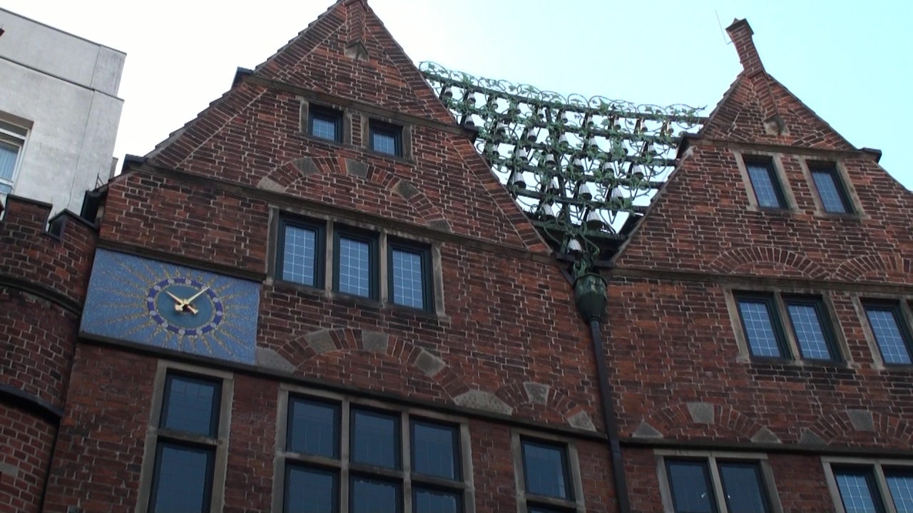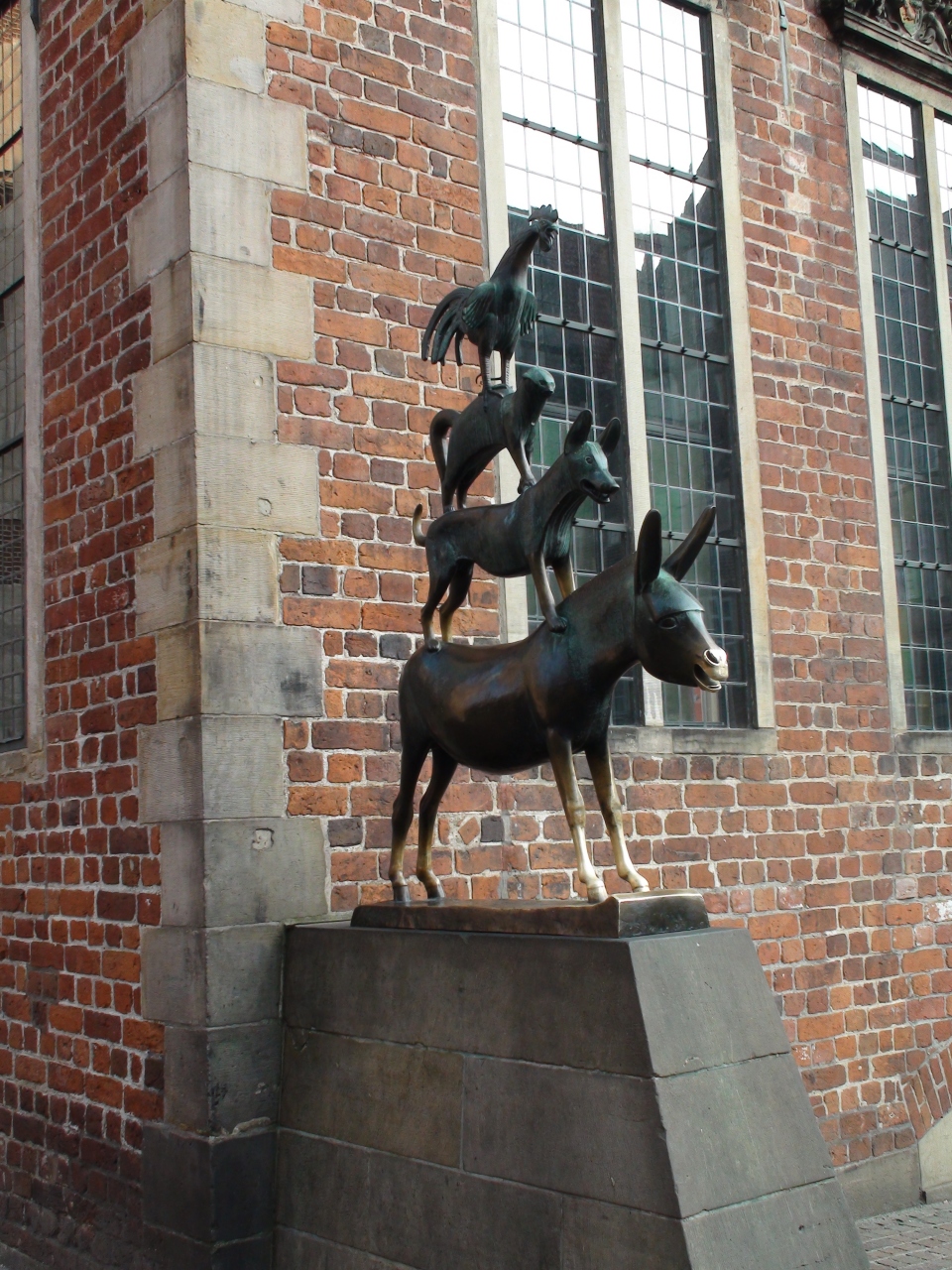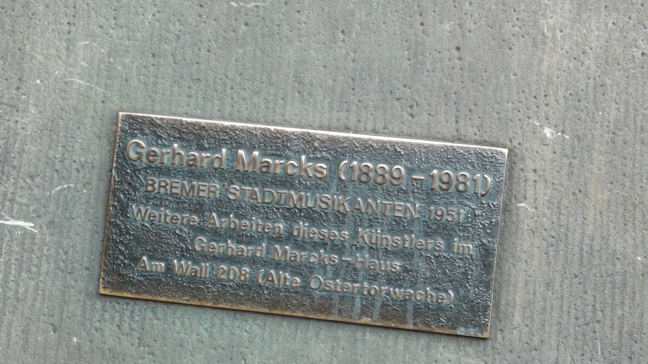 マルクと広場の一角にあり、絶えず多くの人が集まっているので直ぐに判る。ローラント像に向かって右側の緑の屋根の、ルネッサンス様式の壮大なフアサードの建物・市庁舎の入り口に向かって左側に何気なくたっている。