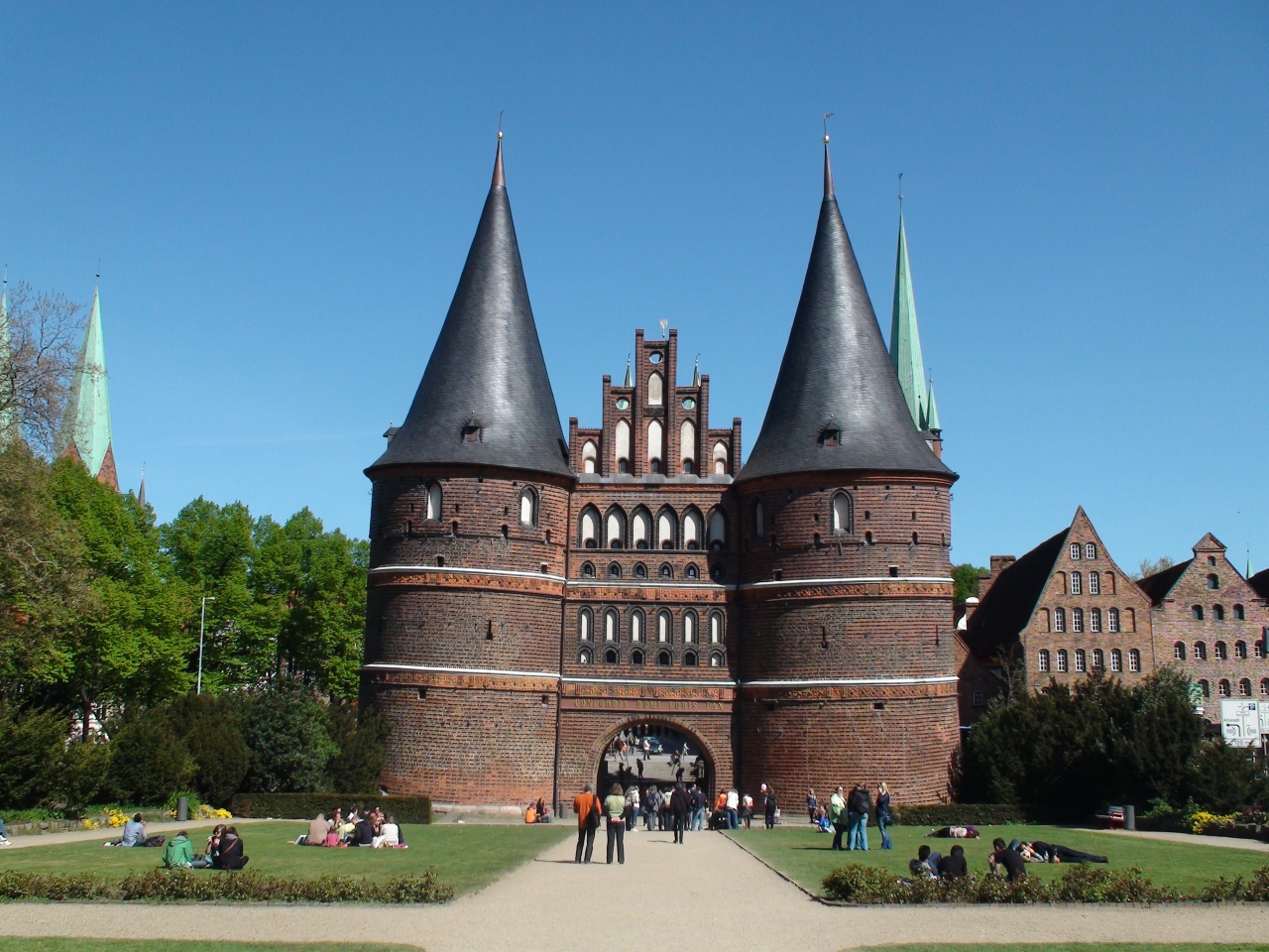 どっしりとした二つの塔からなる市城門で、1464~78年に建てられた。暑さが3.5メートルにもなる部分があるので壁の重みで、建築中からすでに地盤の弱い地面にめり込んでしまっている。よく見ると塔が傾いているのが写真でわかる。リューベックとは団結という意味。