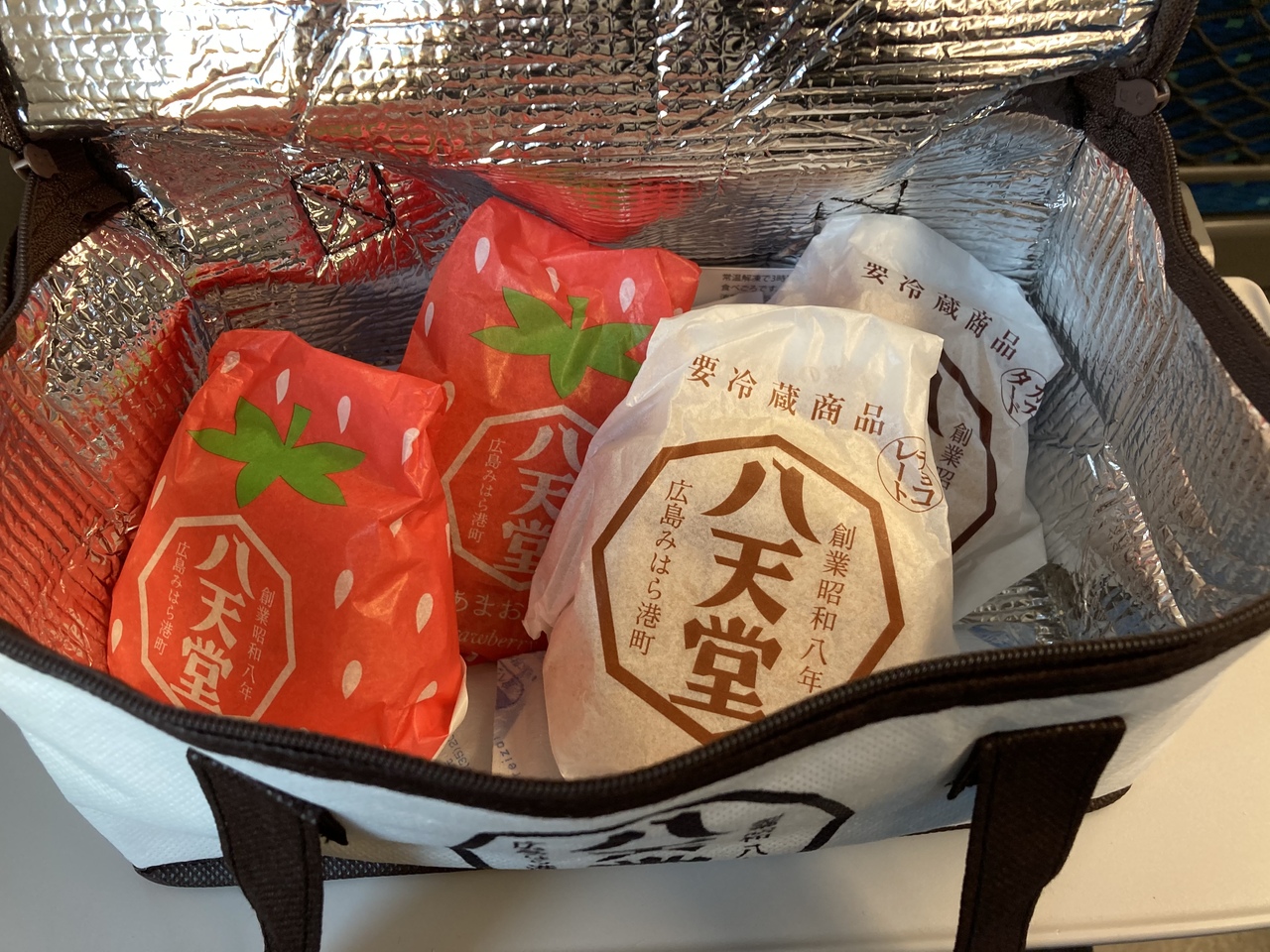 いつも広島出張の際にお土産に買って帰ります。少しでも遅くなると売り切れて購入出来ない事もあるのですが今日は期間限定のあまおう苺バージョンもありました。家までは3時間以上掛かるので保冷バッグに入れてくれるので安心です。しっとりとしたクリームが絶品です。