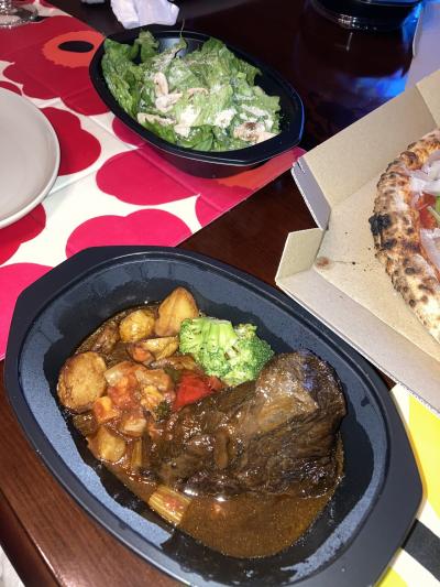 Uberでプロシュートとルッコラのピザと牛ほほ肉の赤ワイン煮込み、シーザーサラダをデリバリーして貰いました。ピザは流石に少し冷めてましたがプロシュートの塩味が効いて非常に美味しかったです。牛ほほ肉も大変柔らかくて満足出来ました。