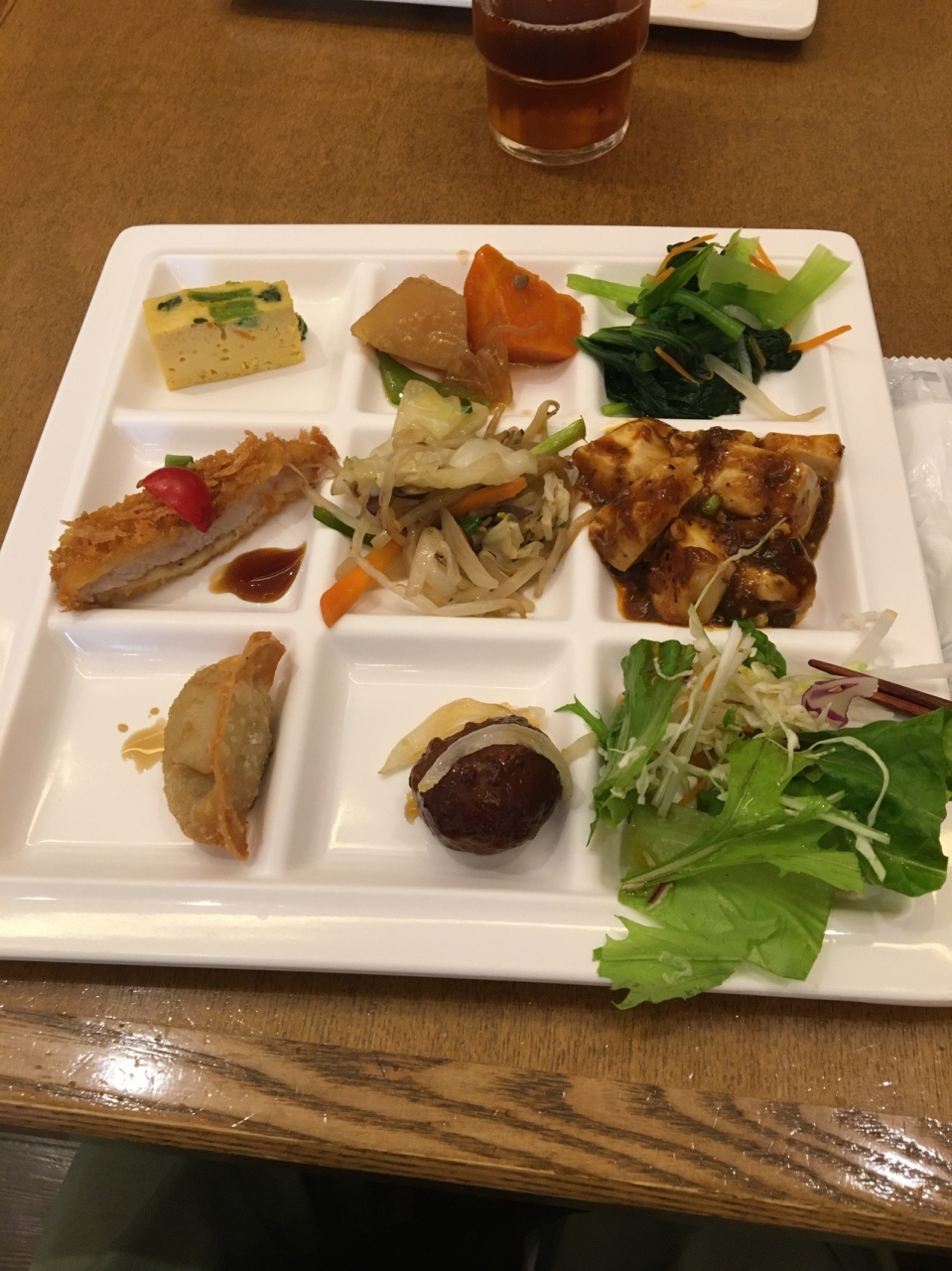 ランチは80分間食べ放題のバイキング料理のレストランです。コロナ対策としてアルコール消毒の他、料理を取る際には使い捨ての手袋を使用するので感染症対策も万全で安心して食事を楽しむことが出来ました。今日は和食メニューが多い様に感じました、どのメニューも美味しかったです。