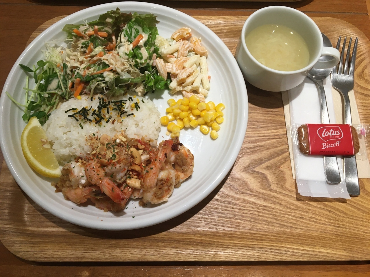 ハワイの雰囲気を少しでも味わいたい、と色々と検索してたらモーニンググラス コーヒーの創業者がサポートしている店を発見して休日のランチで利用しました。コーヒーとガーリックシュリンププレートを注文、店内の内装、BGMと
