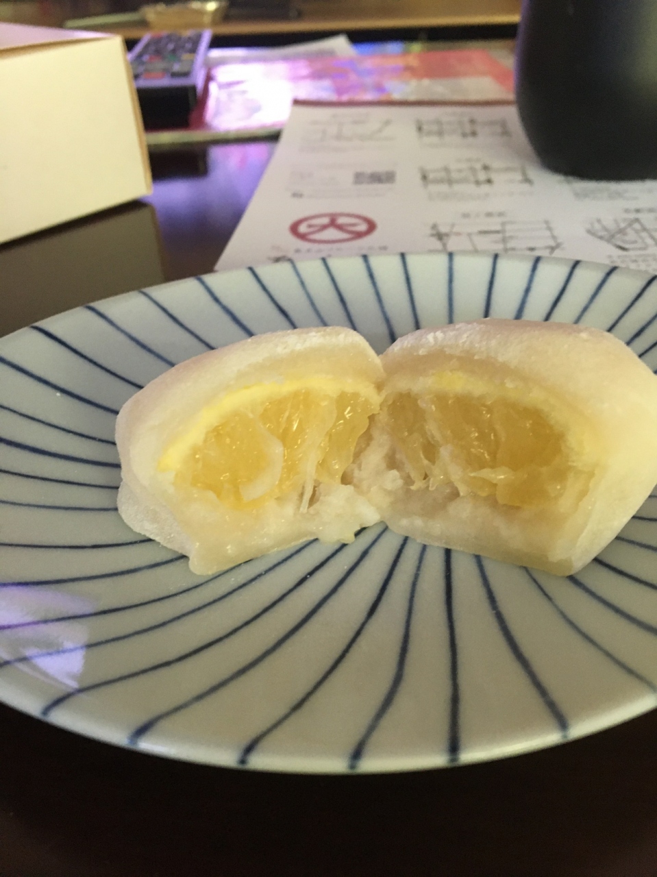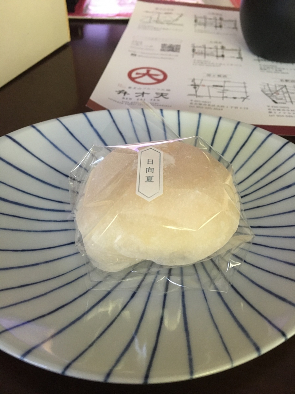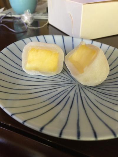 いつも店の前には行列が絶えない店で前から気になっていました。土曜日のおやつタイムに日向夏と完熟バインの大福を買いました。大福を半分にカットすると中には美味しそうな日向夏とパイナップルの果肉が。あっという間に美味しく頂きました。
