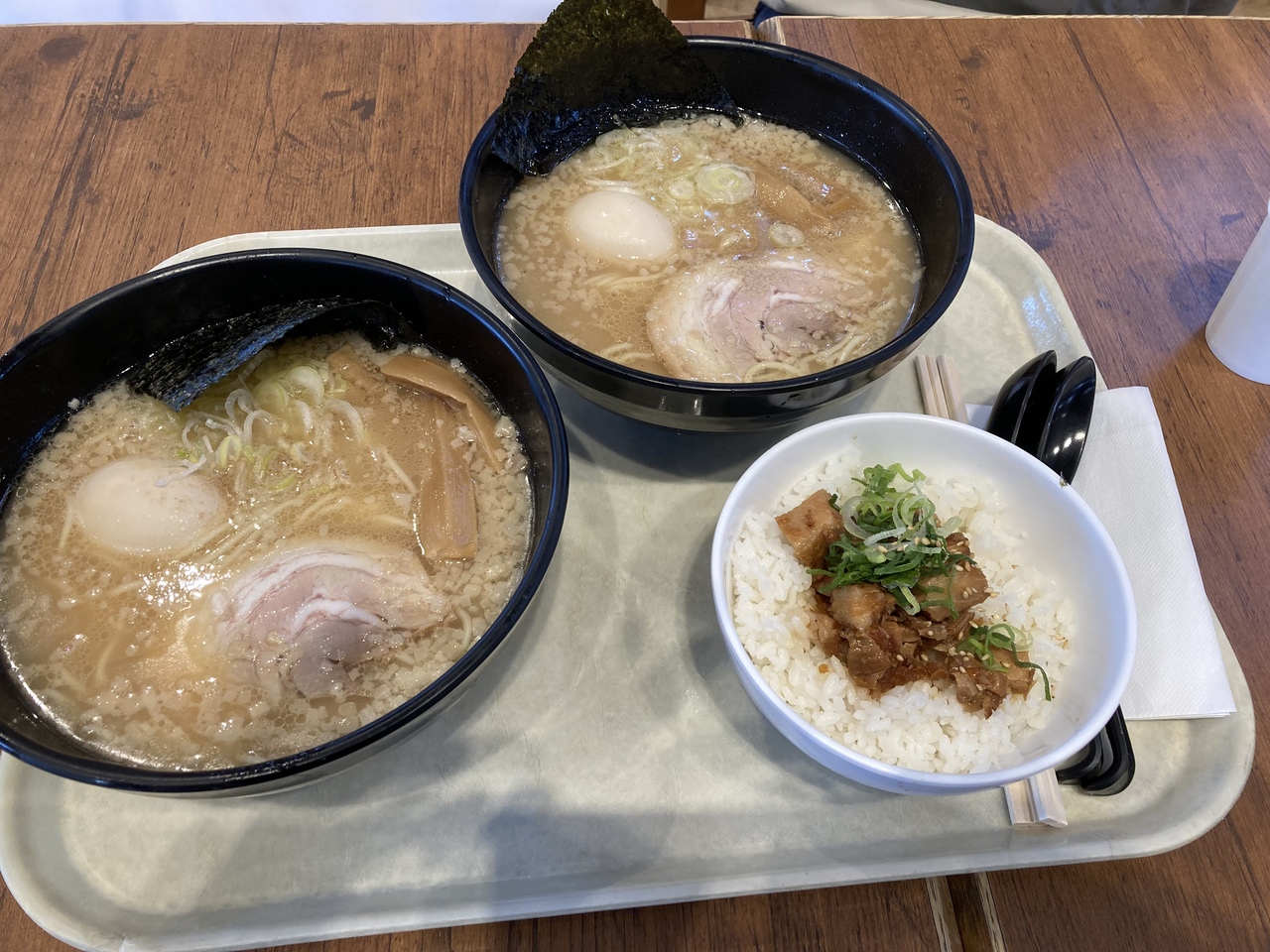 アウトレットの買い物途中のランチで利用しました。寒い日だったので迷わずラーメンに決めました。豚チャーシュー丼のセットを頂きました、ラーメンには味玉子をトッピングしました。豚骨醤油味のラーメンに良く合って美味しかったです。