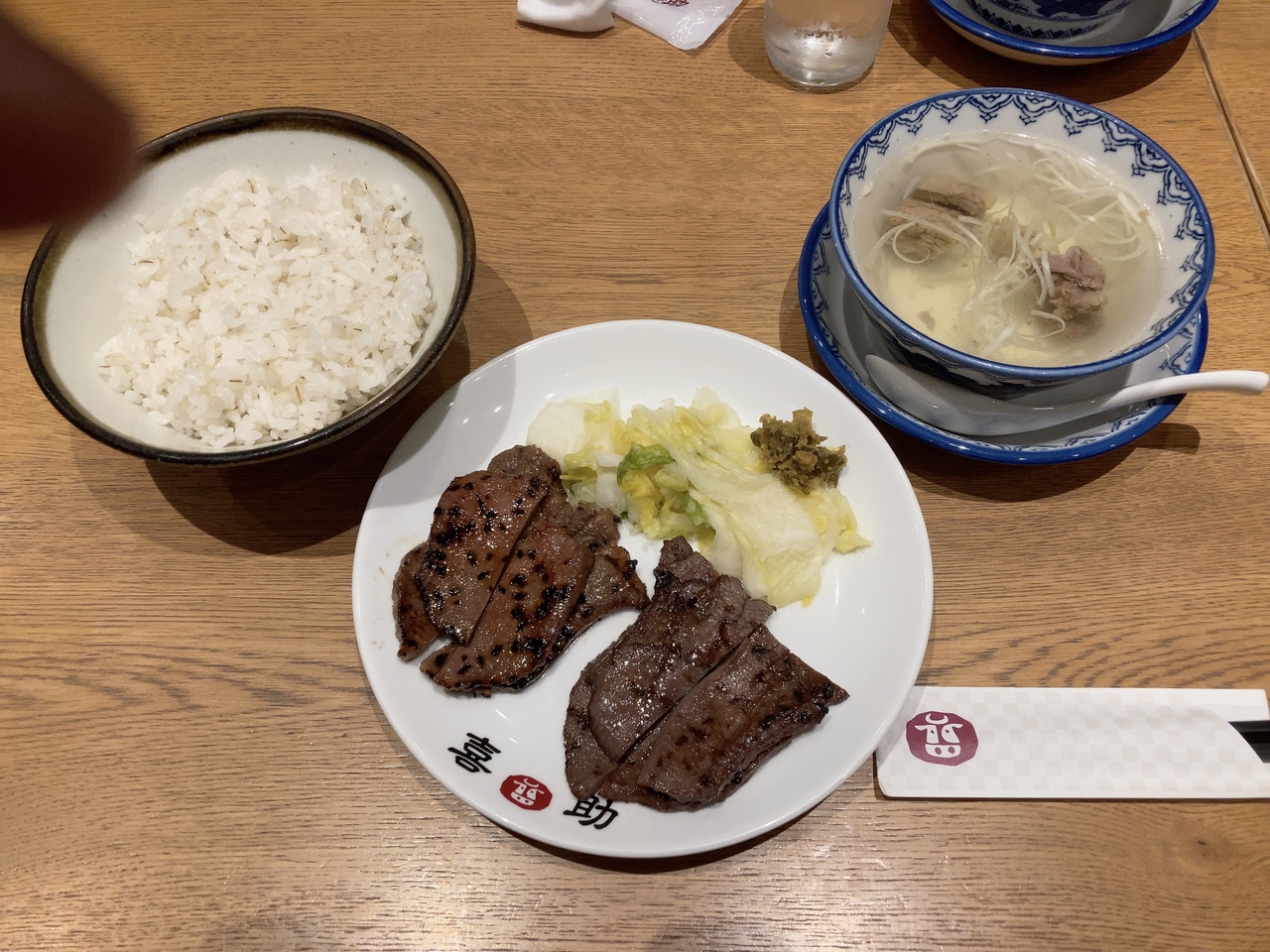 仕事帰りに夕食を久しぶりに外食する事になり大名古屋ビルの地下にあるレストランの中から牛タンの店に入りました。牛タン炭焼き定食のミックスを注文しました。塩、タレの2種類の牛タンが食べれてお得です。ご飯は麦飯でしたが、これが良く合います。スープはテールスープで これも絶品。大満足でした。