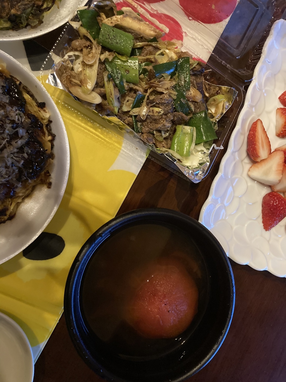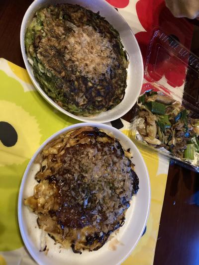 日曜日の夕食に出前館のデリバリーを利用。お好み焼き 2点、九条ネギ焼きと牛スジ焼き、出汁トマトを注文しました。流石に熱々という訳にはいかないが大変美味しかった。特に九条ネギ焼きと牛スジ焼きはワインのツマミに合います。トマトも温かくて美味しかったです。