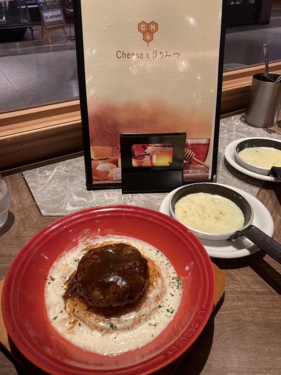 休日のランチで利用しました。ハンバーグドリアを注文、熱々のラクレットチーズケーキが別に運ばれてきて自分でハンバーグにかけて頂きます。トロトロのチーズが大変美味しいです。また器はルクレーゼで長い時間冷めないので最後まで熱々のチーズを堪能しました。
