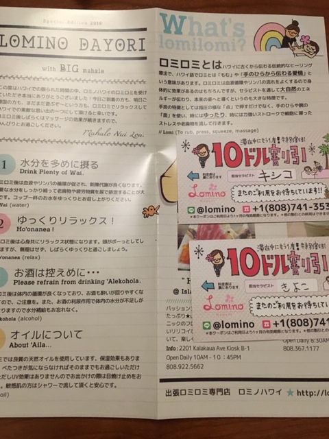 ハワイに行く時にはいつもネットで初日に夫婦で予約しておきます。飛行機で約8時間、疲れた身体をマッサージでリラックス!今回はデトックス90分コースを受けましたが二人とも大満足でした。やはりホテルの部屋に出張して来てくれるので楽ですね。おかげで今回の滞在も充分に楽しむ事が出来ました。料金もメールでチップの事も教えてくれるので無用な心配も安心です。