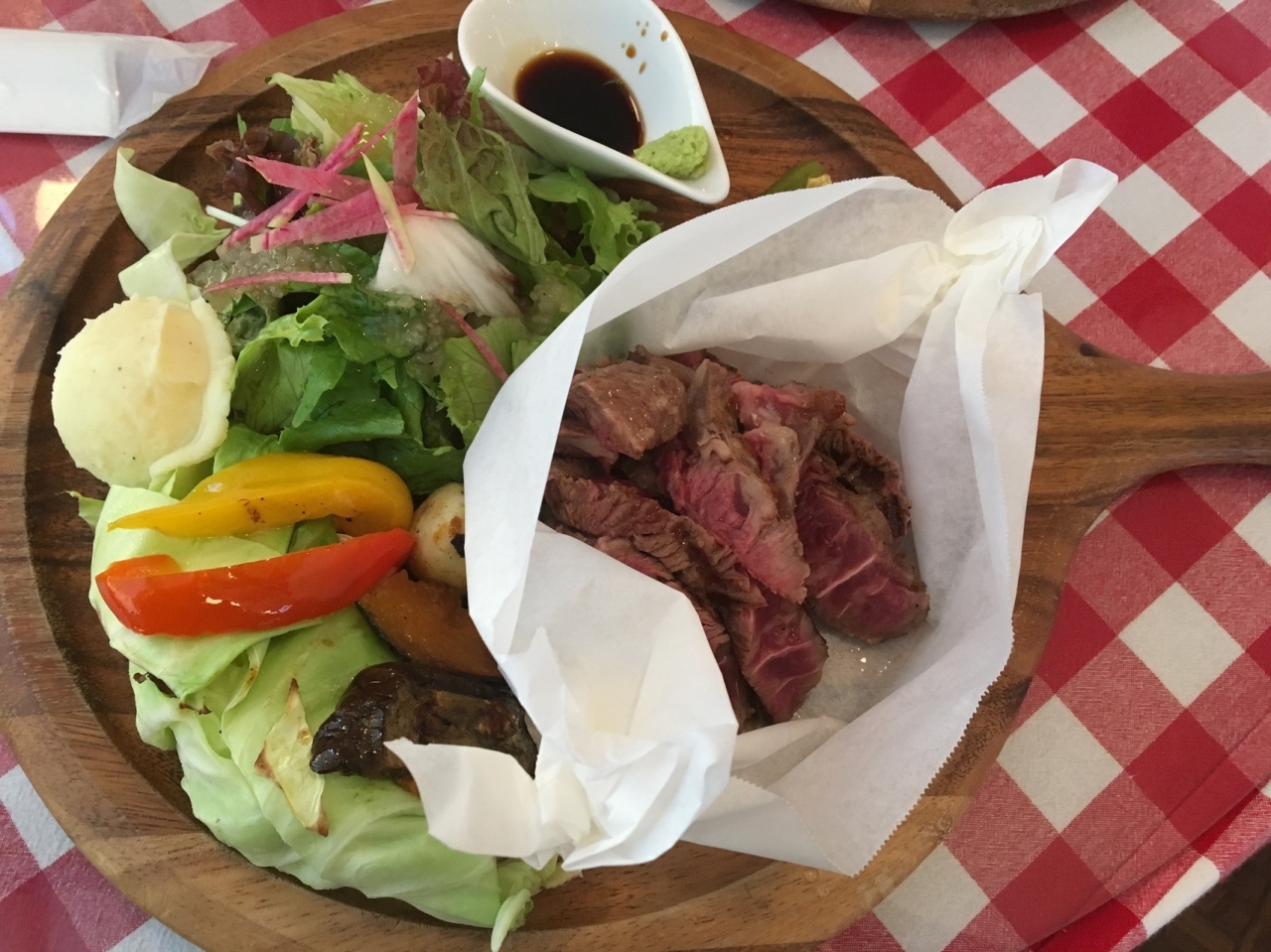 お盆休みの夕食、暑くて夏バテ気味だったので美味しい肉を食べようと思い入った店です。マ メゾンの系列のお店らしいですが本当に美味しかったです。温野菜、サラダとお肉のグリル プレートを注文しましたが、わさび醤油で食べるステーキは あっさりして美味しく頂けました。