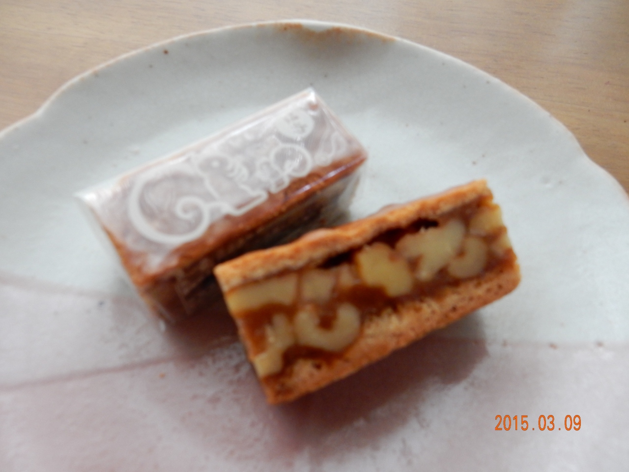 くるみが練り込んであるキャラメルをクッキーではさんであります。