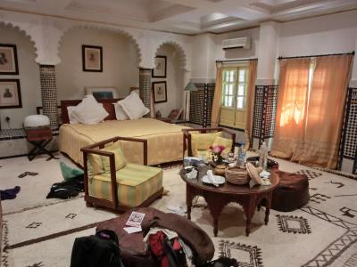 周辺の道路のにおいがきつく、またセキュリティーのために入口のドアに鍵がかかっているので、少々面倒に感じる部分もあります。でも、部屋の中に入ると考えが一変しました。アラブ風のカーペットが敷いてあり、広々とした室内には大きなキングサイズのベッドと、日本製の巨大液晶テレビがありました。水とフルーツも備えつけてある上、ウェルカムドリンクとしてミントティーとお菓子が運ばれてきました。