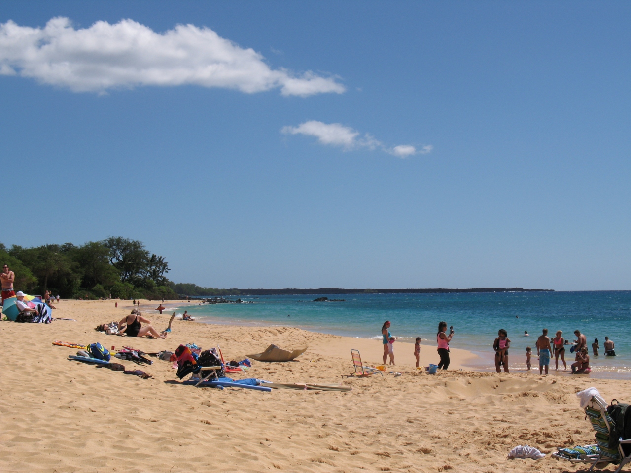 ワイレアのフォーシーズンの先Makena Drをしばらく走行すると右手に駐車場が見えます。平日でも満車状態で混んでいます。その場合はもう少し南に行くと二つ目の駐車場がありますので、多分止めれるでしょう。ここのビーチは景観もよく適度な人ごみでライフガードもいますので、泳ぐには安心でしょう。すべてと言っていいほど欧米人です。ここのビーチはBig Beachといい、岡を超えた隣がLitlle Beachと言ってヌーディストビーチとして知られていますが、残念ながら?私は行ったことがありません。