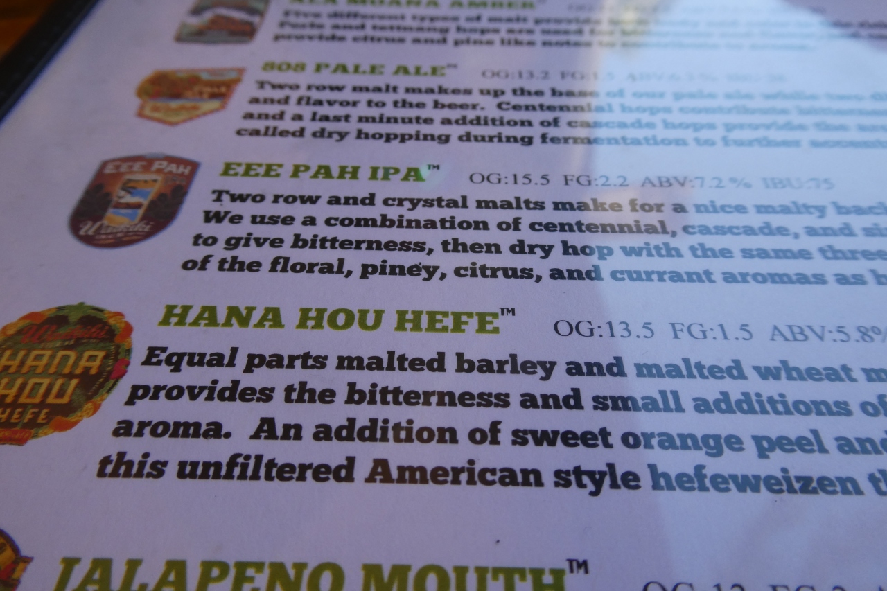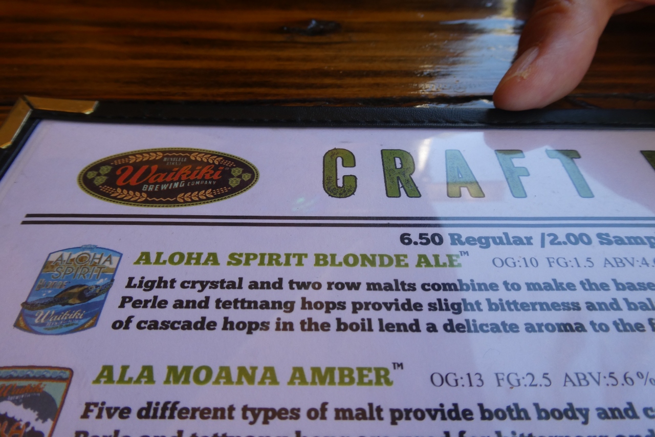 ホノルルには多くのクラフトビール店があるが、ワイキキ滞在で便利なのはこの店かマウイブリューイングだろう。到着当日の疲れた身体を癒すのにはもってこいの場所でなかろうか。クラフトビールはハナホウへフェ、アロハスピリット、スキニージーンズ等数種類あり、それぞれのアルコール度数や酵母の比重等も記載されており、レギュラーグラスで6.5ドル、サンプラーで2ドルになっている。ビールだけではなく食べ物もありケサディーヤ等や隣の姉妹店チーズバーガーインパラダイスから名店のバーガーも取り寄せることができるのでお酒が飲めなくても楽しめる所である。