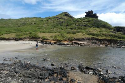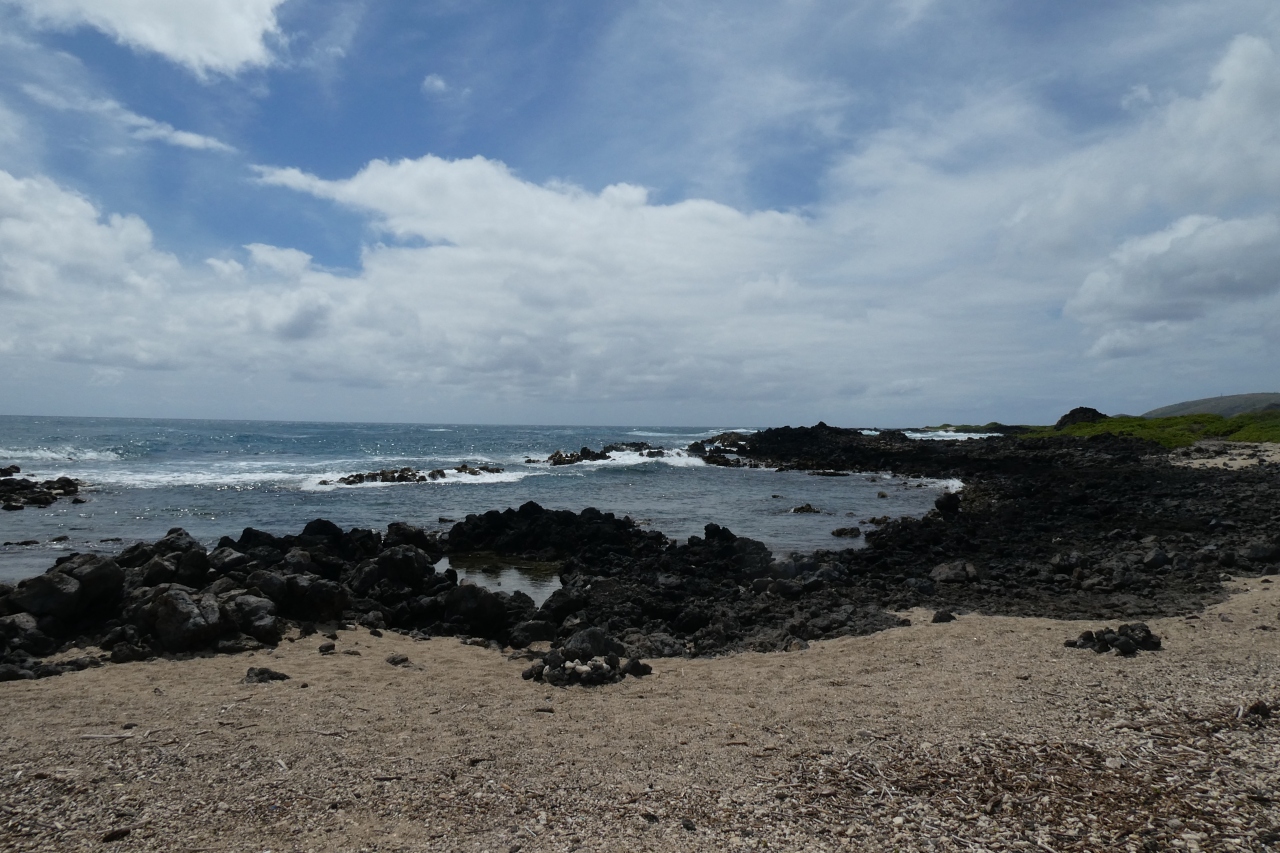 マカプウライトハウストレイルの駐車場の入口から左はライトハウスのトレイル右の小路を10分程度歩くとビーチに出る。ここからはペレの椅子を見上げることができるし、ツーリストもほとんどいない静かでオゾンに満ち溢れている。ただし、このビーチには何の施設もないので、花を摘みに行くか雉を撃ちに行くしかないのが難点だろう。