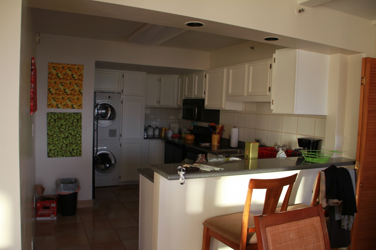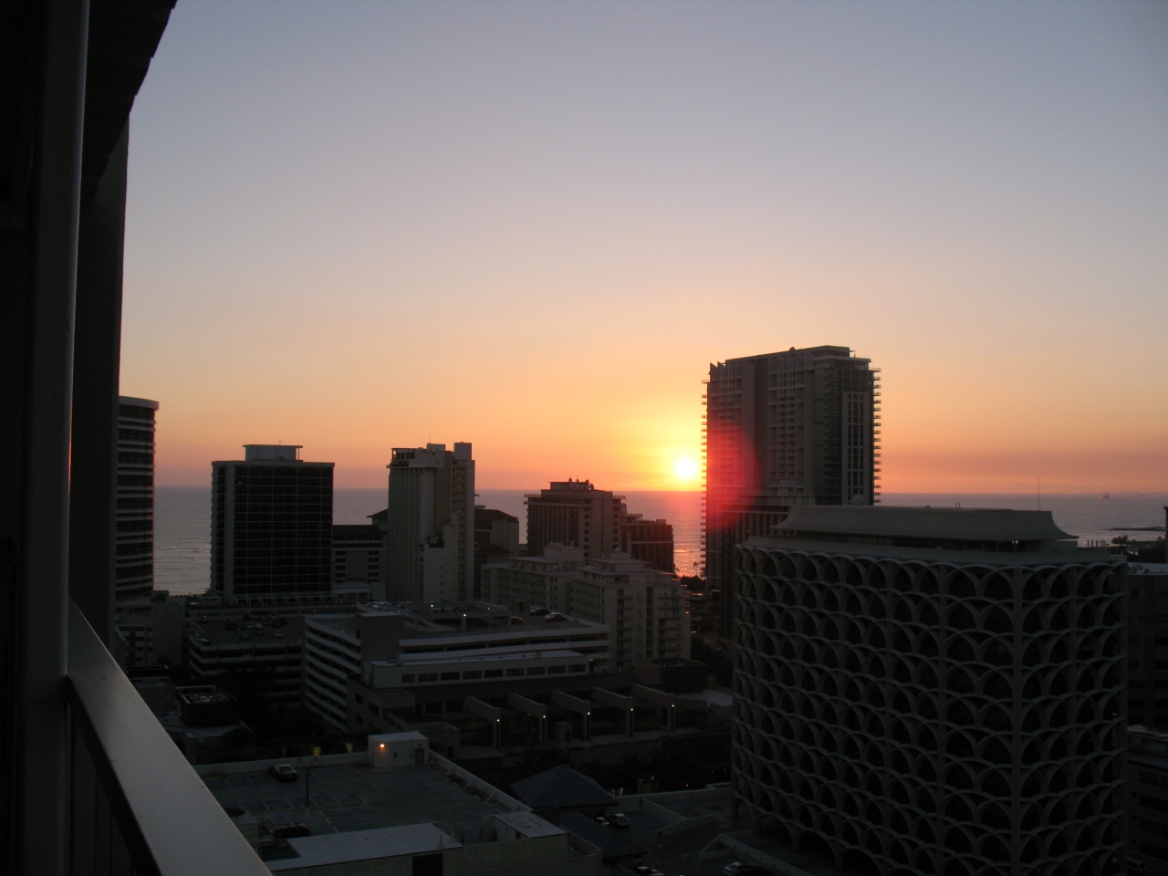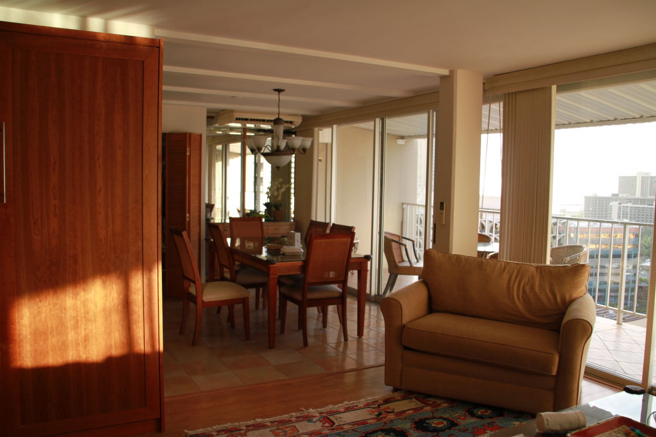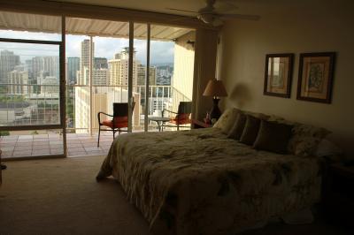 ここはホテルというよりコンドです。クヒオ通りに面してDFSの隣になりますが、PHは最上階のためパーシャルとはいえ海がはっきりと見えます。レンタカーで行動する私達にはワイキキでは高い駐車場も無料でついているのがうれしい。部屋に上がるには貸与されているキーがないと部屋の階にもあがれませんので、セキュリティー面でも安心です。基本1ベッドルームですが、マスターベッドにウォールベッドそれにソファベッドがありますので、大人6人が滞在しても余裕です。長期滞在にうれしいのはなにより室内に洗濯乾燥機があることに加え大型冷蔵庫とフルキッチンでしょう。トイレバスも二つ備わっています。ヒルトンの金曜日の花火も見えます。