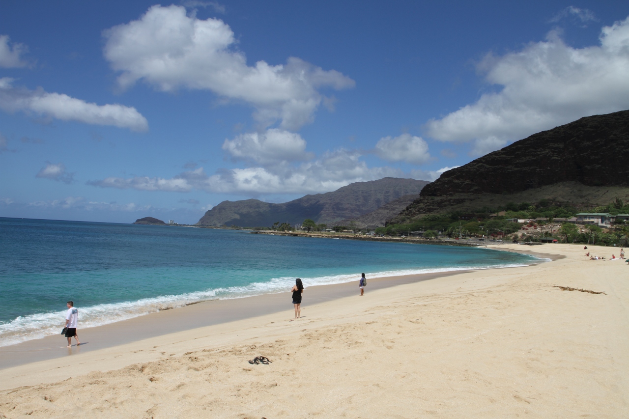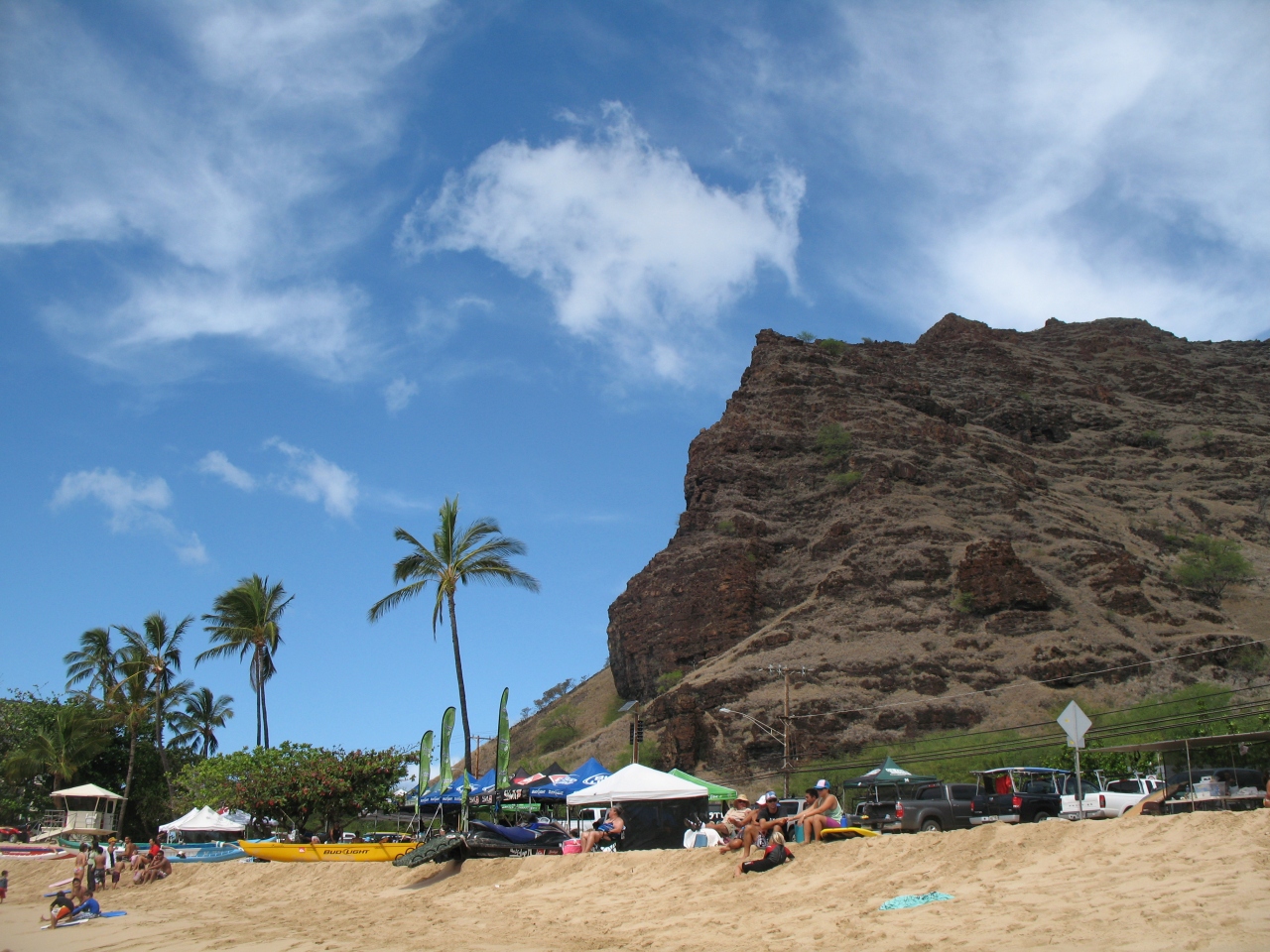 ワイキキから車で約90分近く走行するとビーチ沿い左側に数階建のコンドが見えます。右側に駐車場、トイレにシャワーの建物があります。そこがマカハビーチです。ライフガードもいますので、安心してすごせるビーチで、普段は僅かなロコとコンド滞在者ぐらいしかいない静かなビーチですが、たまにサーフィンの大会もあるらしいです。